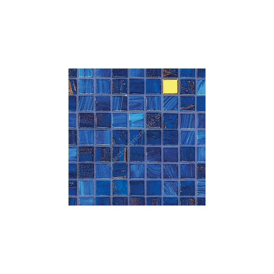 Glass mosaic composed of beveled, randomly arranged square tesserae. The oro bis tesserae present in the blend are fashioned with 24 kt gold leaf between two protective layers of glass.