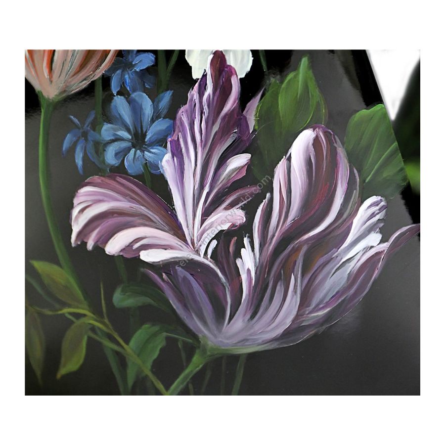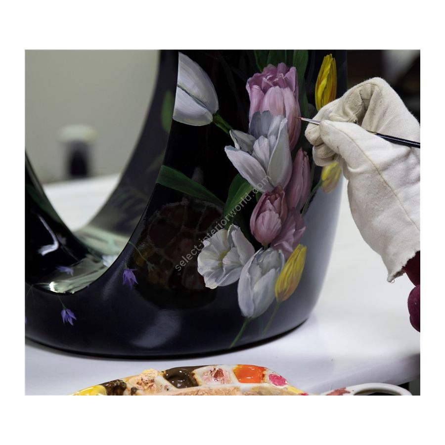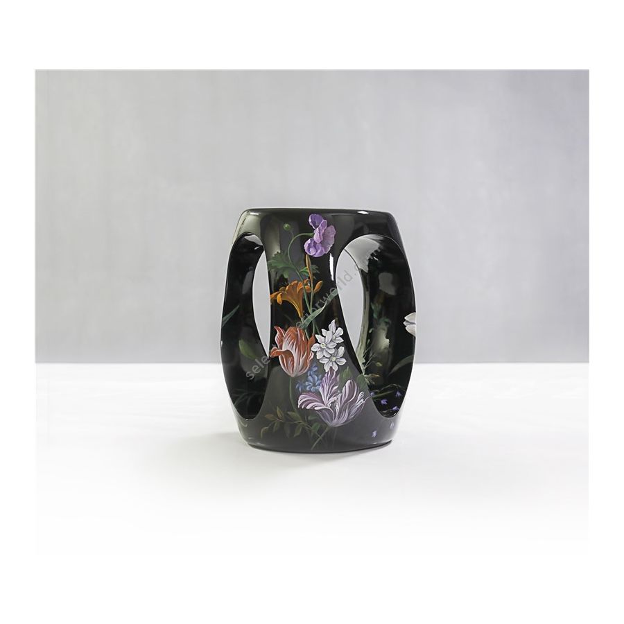Floral is a soulful stool which evokes Portuguese Romanticism traditions thanks to its gentle flowers delineated with oil paint over a black background. It marries perfectly ancient painting techniques with contemporary design. The Floral art piece was born from the delicate oil painting, which gives a modern look to floral elements. The challenge of recreating an ancient technique to bring to life an Art stool was proposed to Santa Bárbara’s atelier, renowned in Portugal due to its high quality and detail in painting applied to restoration. Expertise in craftsmanship allowed master artisans to adapt this craft often used in furniture and murals. The result is a masterpiece filled with a unique elegance and detail which can only be achieved by hand craft. Its pictorial quality is remarkable.