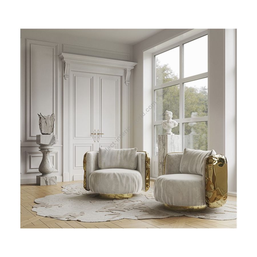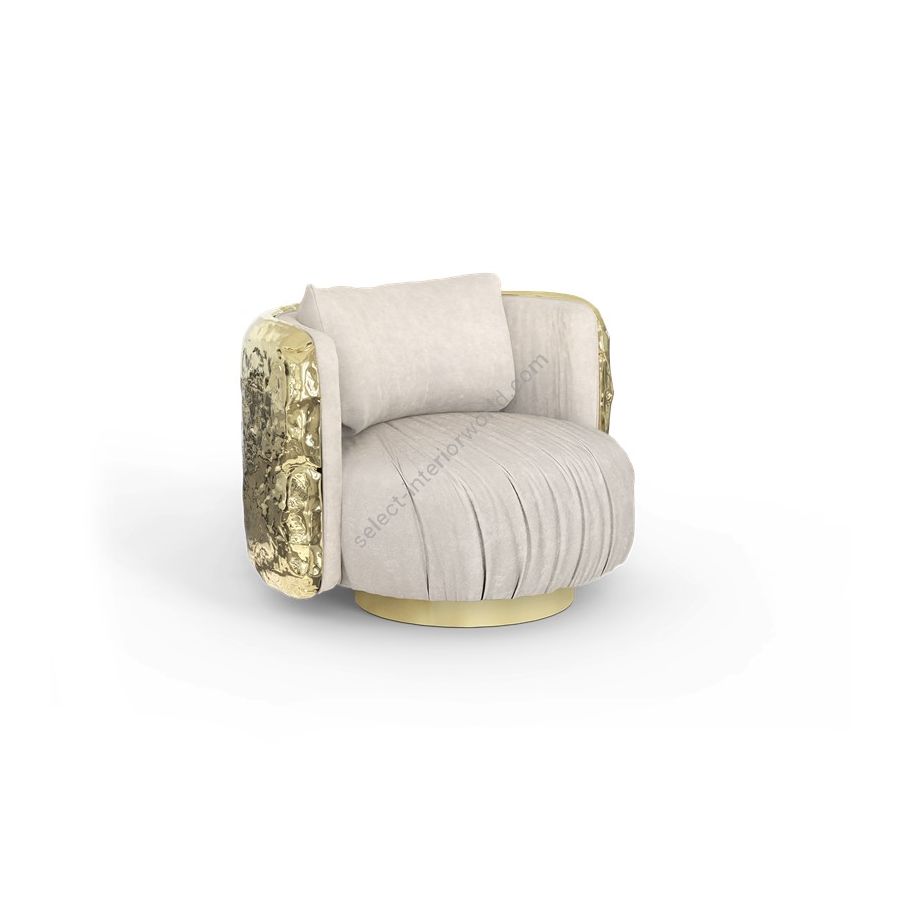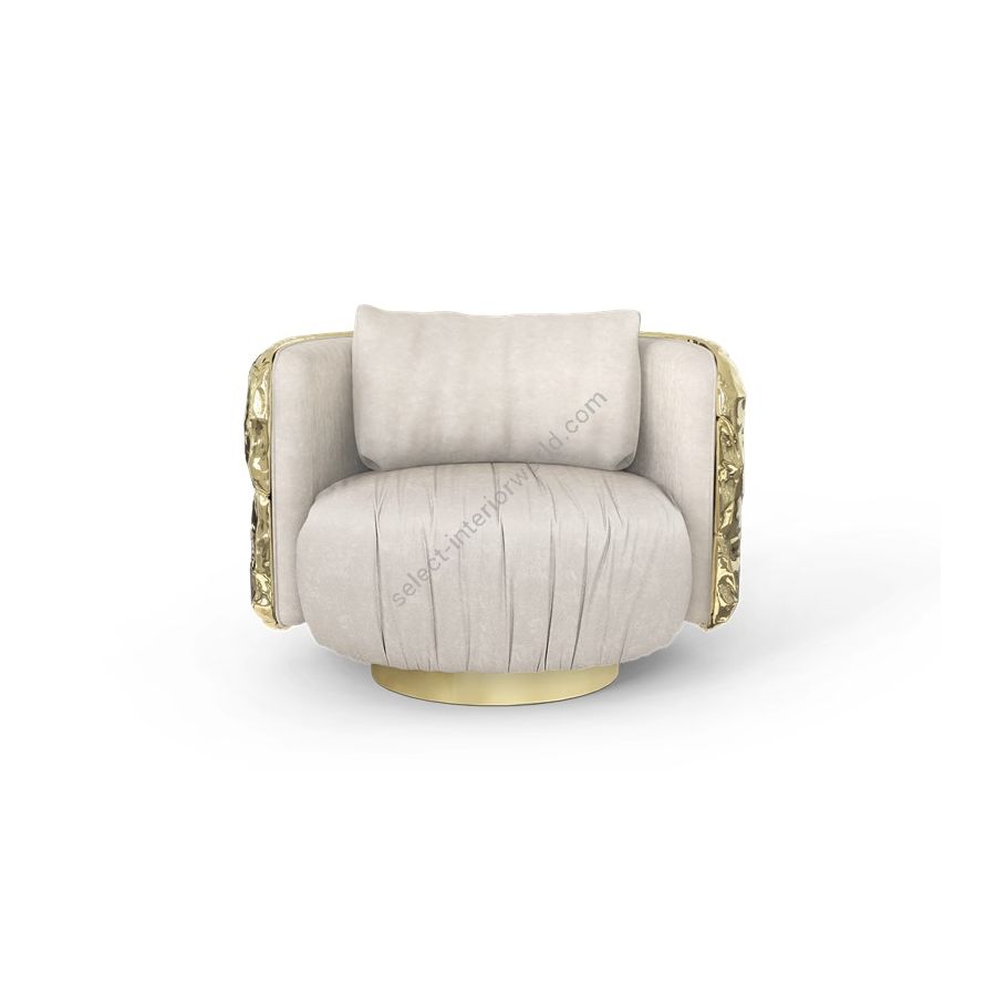 The armchair has a curved wooden hull structure with a back rest. In that back rest we find a polished hammered brass application that simulate a pillow with gloss varnish. The sofa is supported by a brass plated cilinder, with a rotary system, with gloss varnish finish. The fabric of both the sofa and pillows is Elastron, Macau Sand.