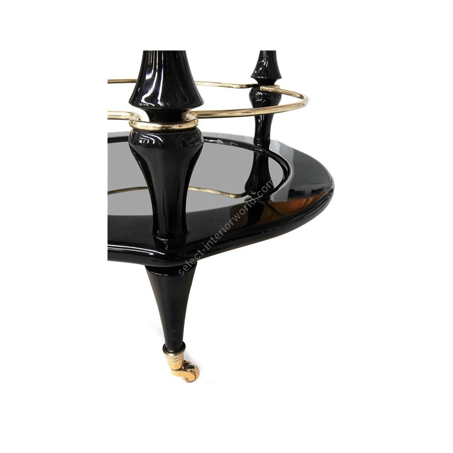 Globe made from polished brass, manually hammered. Its legs and bottom head are made from wood lacquered in black with a high gloss varnish. In its interior there is space for glasses and bottles. The surface of the bottom head’s base is made from black lacquered glass.