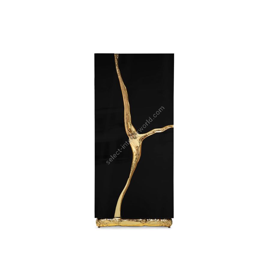 Coated exterior in black lacquer and gold finishes in hammered polished brass. Interior in Poplar Root & Polished Brass. Features 3 doors, 6 drawers, 6 glass shelves.