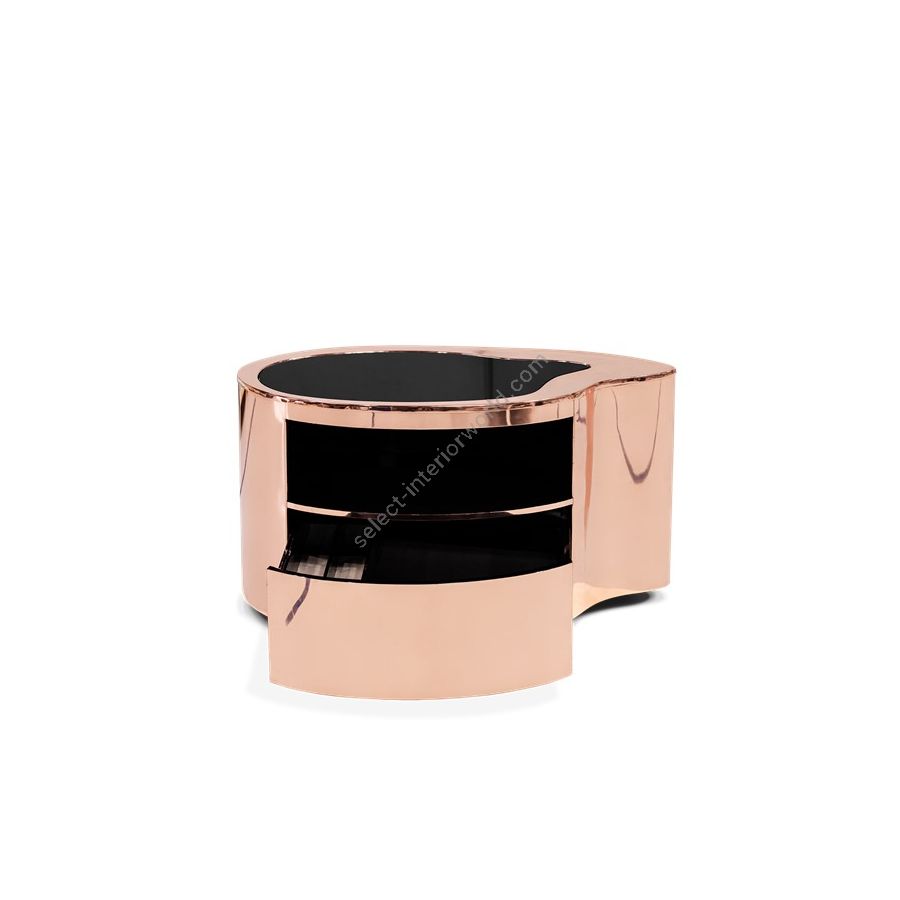 Made in wood finished with manually hammered copper, with a curvilinear top made from black mirror. The base is lacquered in black finished with a high gloss varnish.