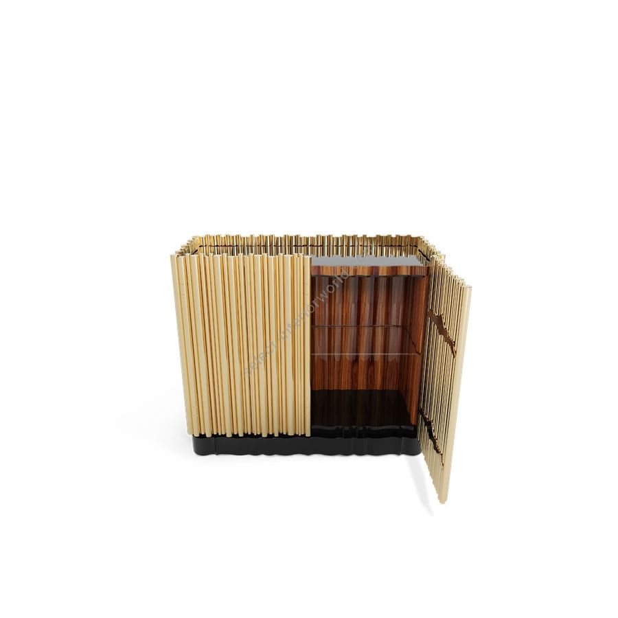 This buffet presents a strong wood body enveloped in a tubular cluster of either gold or nickel plated brass tubes, where each door is carefully welded with cutting edge-technology. A harmonious artful juxtaposition that adds rhythm and sophistication to any space. Symphony is wrapped up by a strong black lacquered base, while the top is finished in opaque black glass.