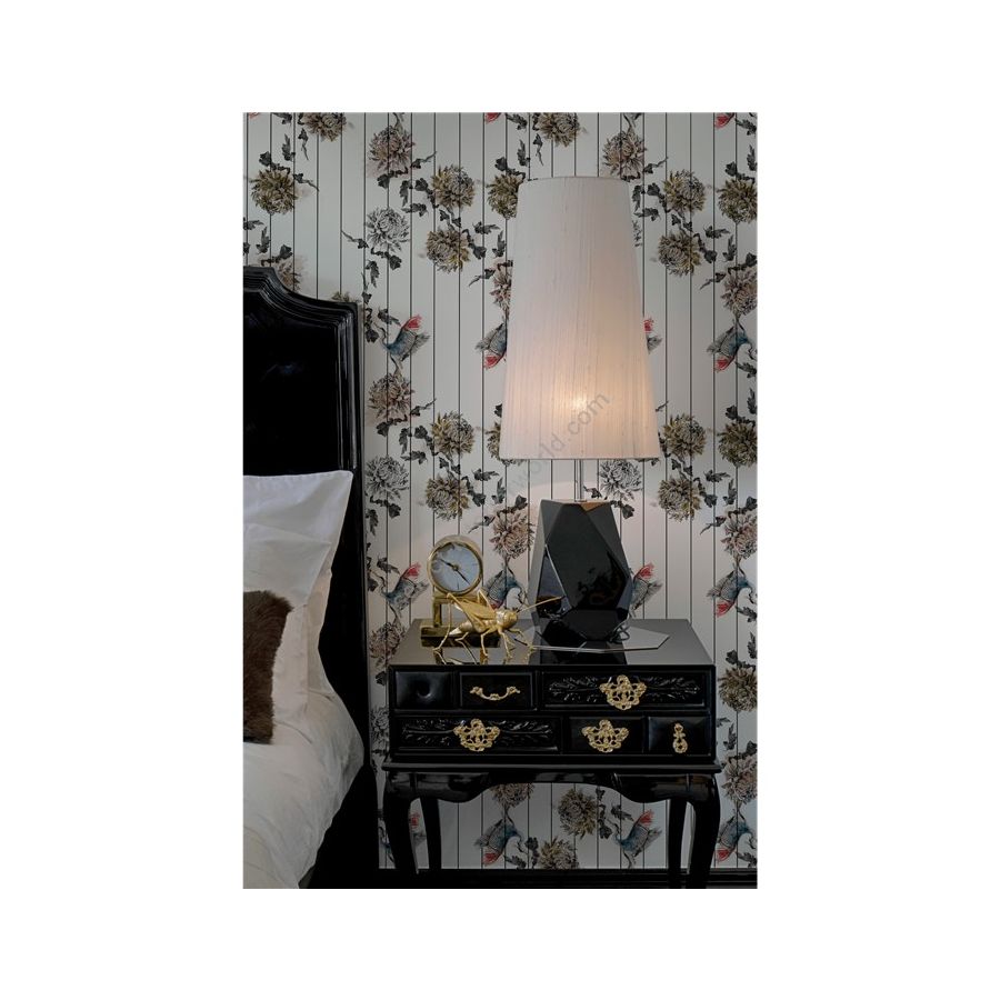 Feel is a table lamp, but actually, it can also be a modern bedside table lamp. It can be elegantly used in your living room as sophisticatedly in your bedroom. Handcrafted by Boca do Lobo, Feel is an exclusive lamp covered with silver leaf, the shade is silk and the base is polished stainless steel. Feel lamps allude to mineral forms and natural materials to produce sculptural pieces. Highly decorative, Feel’s lamps base is available in emerald, lapis, amethyst or citrine.