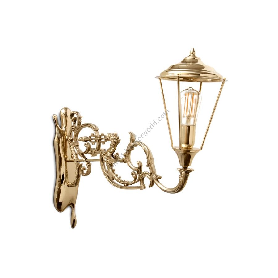 The mystic of late XIX century boulevards are brought home by the cutting-edge Lumière wall lamp. A confluence of Victorian street lights and architectural tectonic form, the Lumiére exemplifies the contemporary dualities of art and functionality. An antique fixture in polished gold plated brass with an intricate edge detailing arm topped by an elegant pane glass lantern hand-sculpted by a casting mold. Born from the rich tradition of iron forging and skilled goldsmiths, this majestic wall lamp is a soulful piece with classic distinction for outstanding private residences to the greatest contract settings. A ground-breaking collectible design for present-day luxe and timeless statement.