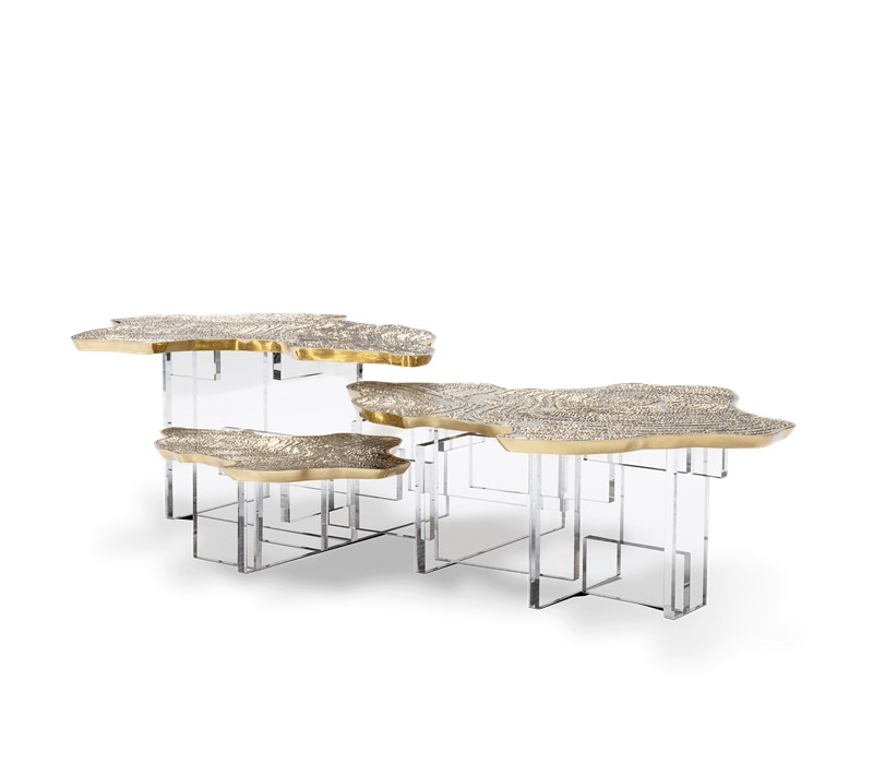Monet is a tribute to the renowned French painter behind the Impressionism movement, and artwork that turns into a contemporary coffee table with a modern design twist. Innovatively depicting nature, the Water Lillies series are gently brought to life in an elegant coffee table with a gold surface made from cast brass with a unique textured finish. Featuring both contrasting shapes and materials, as the unconventional compositions of the artist, the contemporary coffee table is supported by a geometric acrylic base, allowing to capture natural light. An immersive exceptional object, the Monet coffee table is perfect for cutting-edge living rooms.