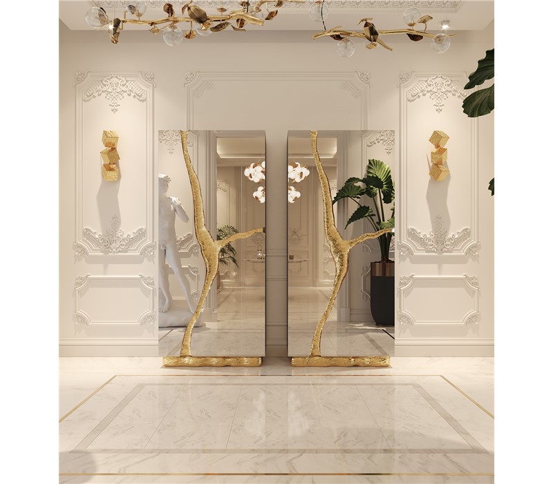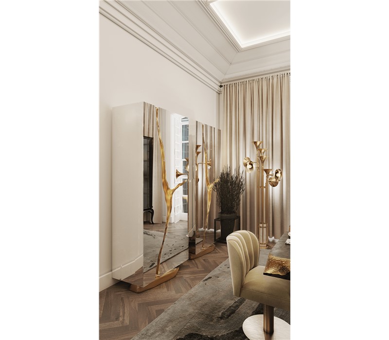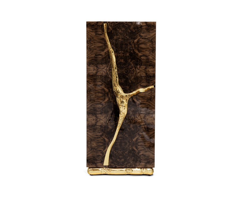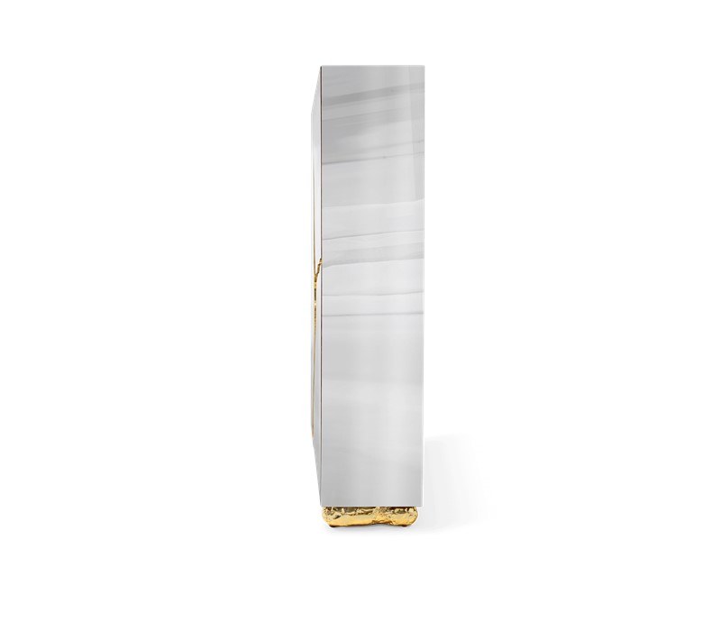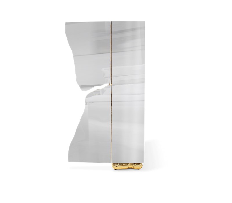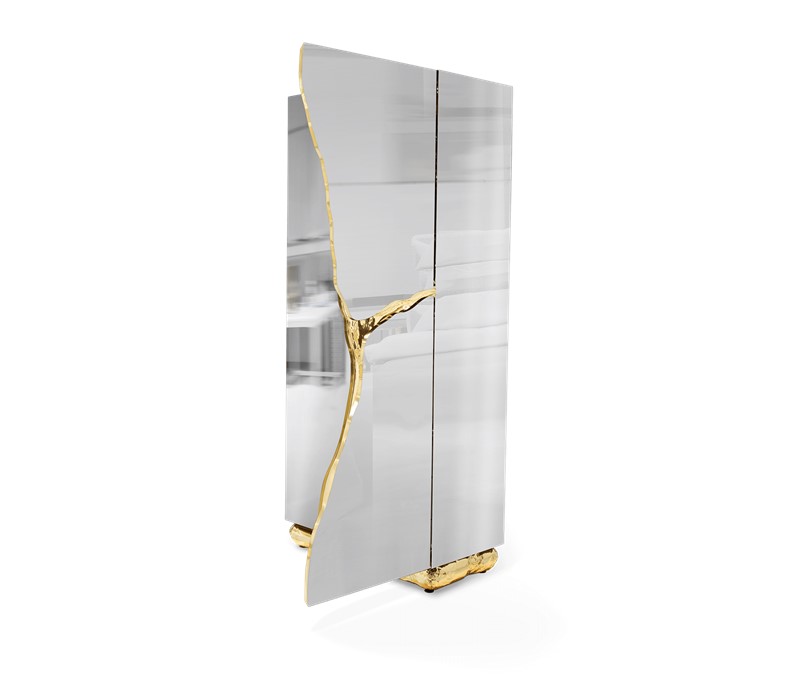 Lapiaz cabinet takes exceptional craftsmanship and design to a new realm. Finding beauty in the most unexpected places, this contemporary design piece is inspired by authentic karst formations. Its organic features are achieved through the manual fitting of polished brass, and a sharp finish in polished stainless steel that portrays a perfect mirror. Different-shaped doors and drawer open to a distinct poplar root wood veneer interior. The hammered gold details and the mirrored façade conveys both dynamics and elegance, a beautiful duality between power and refinement to bring a new contemporary verve into interior design. A functional artwork piece born from cold and freshly cracked to showing off the world rich, golden details.