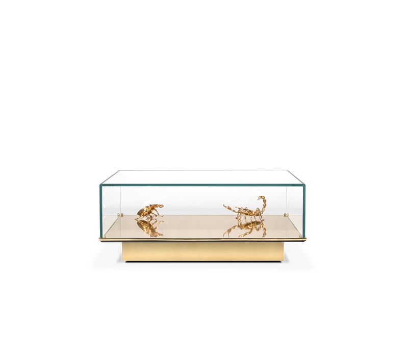 Table 1: Gold Plated Brass, Glass. Decorative elements: 1x Pollock Beatle 2x Scorpion - Gold Plated Brass.
