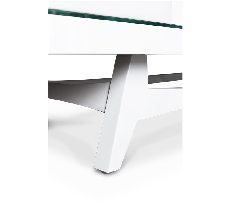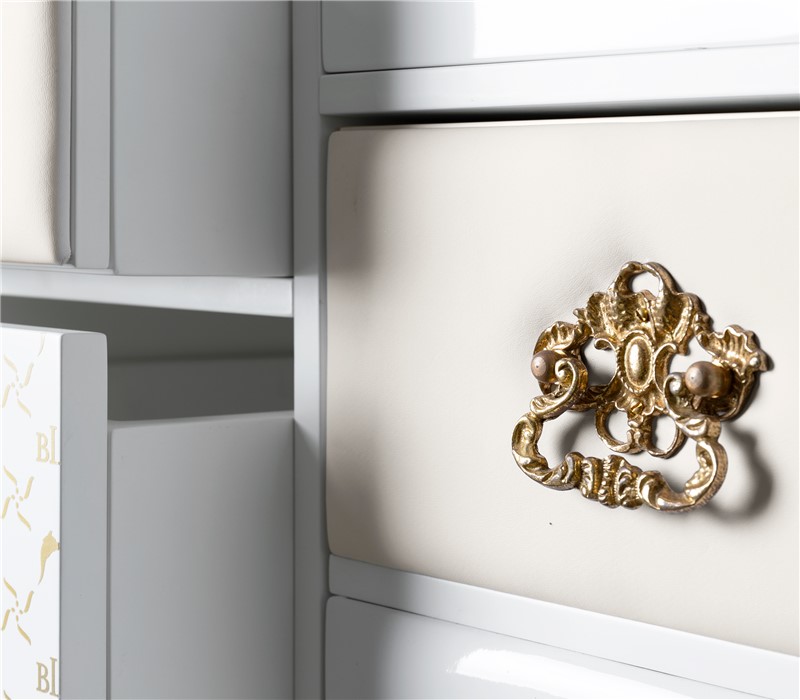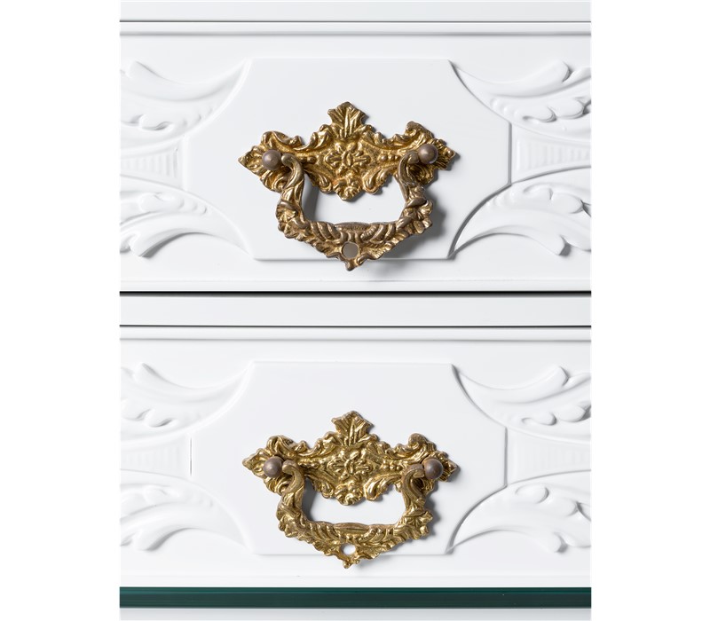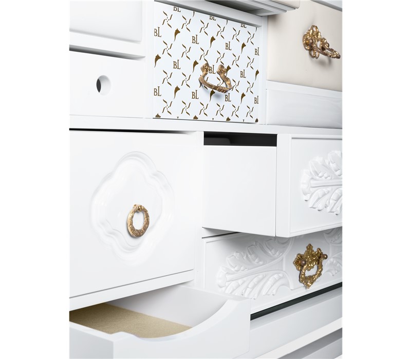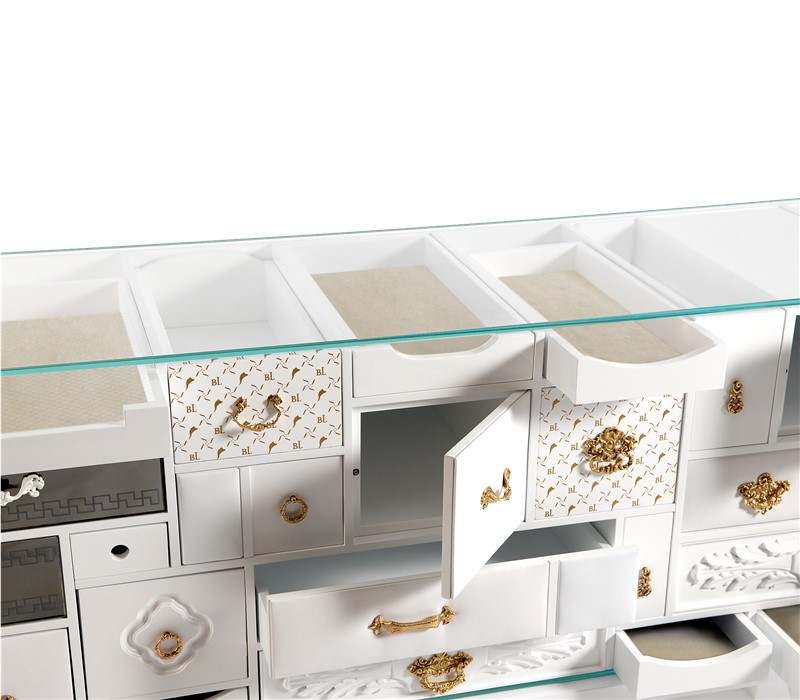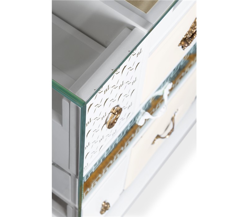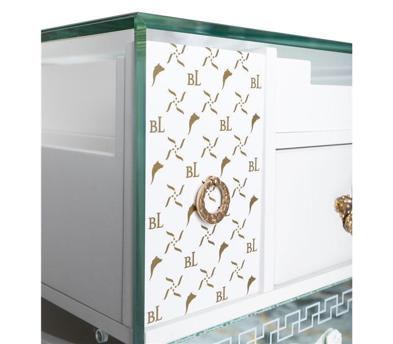 This modern sideboard features a mahogany structure gently involved by an elegant frame of tempered glass. Composed by a set of drawers and doors with different styles, it exhibits from carved details finished in high gloss colored lacquer, mirrors and cut glass, to sophisticated leather details, topped by sleek brass handles with classic shapes and crystals. Quieter hues of white and gold brings sense of la dolce vita, an innate sense of heritage blended with haute couture furniture for a timeless interior design.