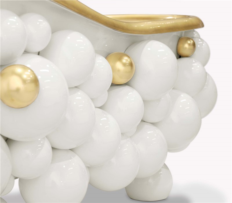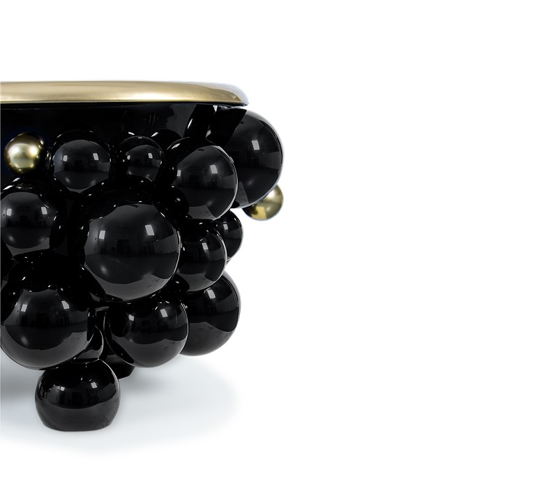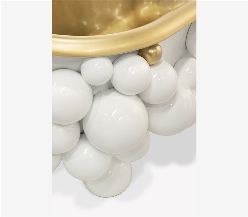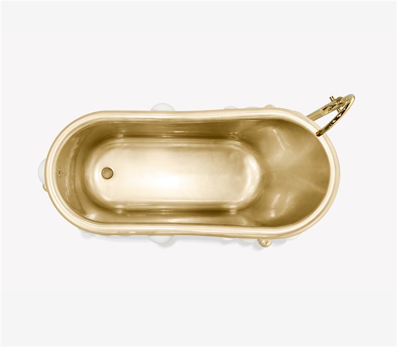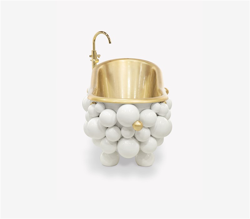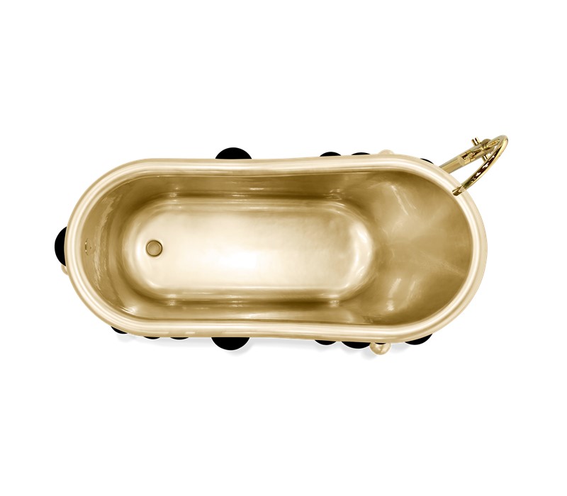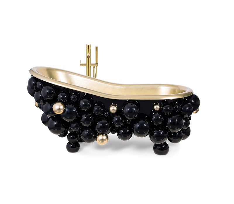 Newton is an outstanding moment of design inspiration. This bathtub features a curved lip style shape, a timeless detail that conveys comfort, made out of gold-painted casted iron, revealing its entire golden interior. The high-gloss black and gold lacquered spheres make the perfect combination to make this a sculptural and artistic piece that will enhance your new Master Bathroom Design.