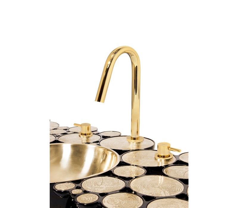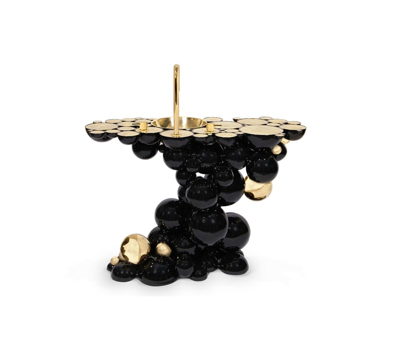 Structure: Casted aluminum, High gloss black lacquered | Polished Brass spheres, High gloss varnish; Top: Casted brass, High gloss varnish; Sink: Polished brass, High gloss varnish; Water drainage: Wall