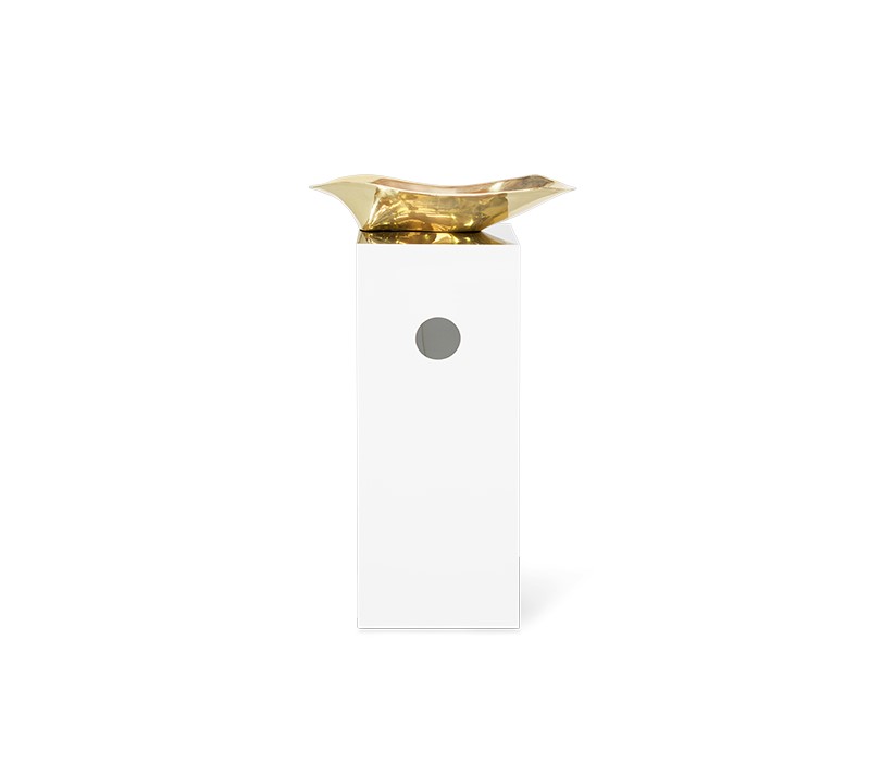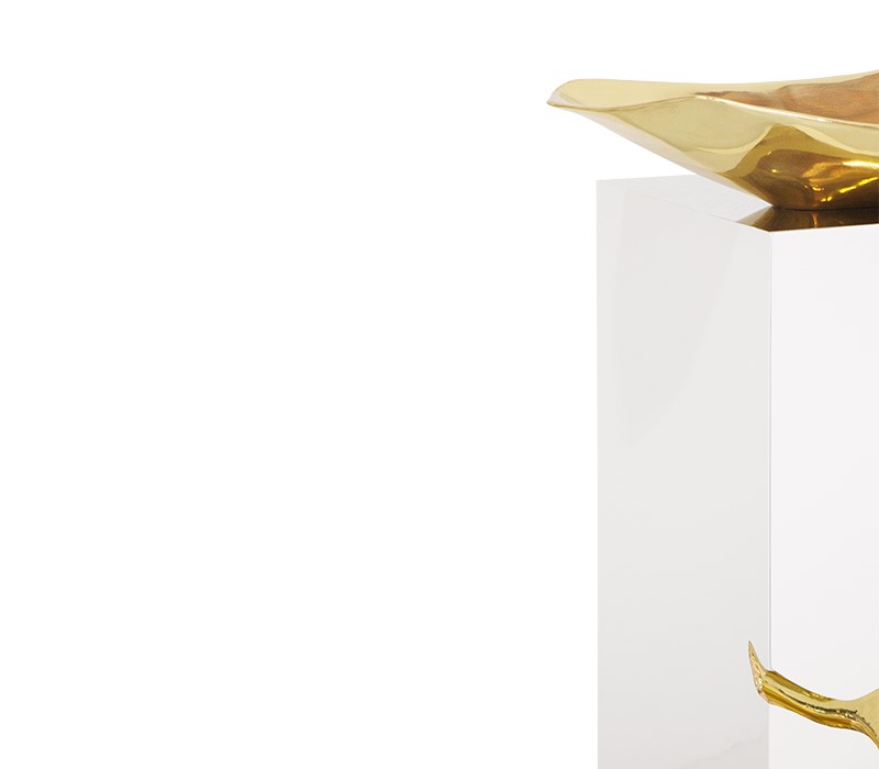 The french word is the name given to the typical karst formations produced by surface dissolution of limestone or dolomite rocks. It can also be caused by freezing and thawing in cold climates. This is how Lapiaz washbasin emerged. Imagine a stone freezed and freshly cracked to show the entire world a rich, golden interior. The polished brass details and mirrored sides attribute this luxury design artwork an artic yet comfy and warm beauty. A real statement piece for the most luxurious bathrooms.