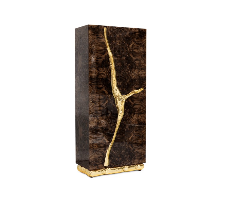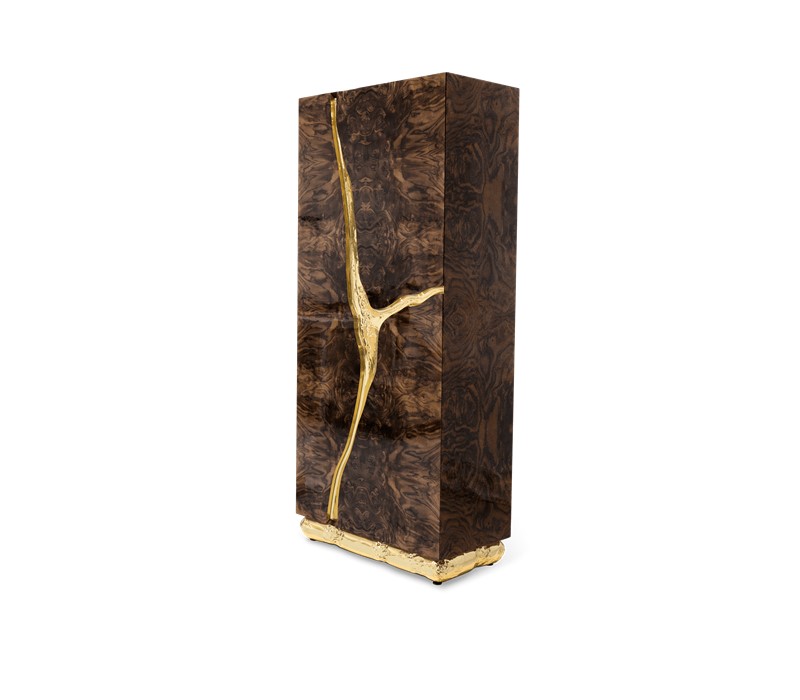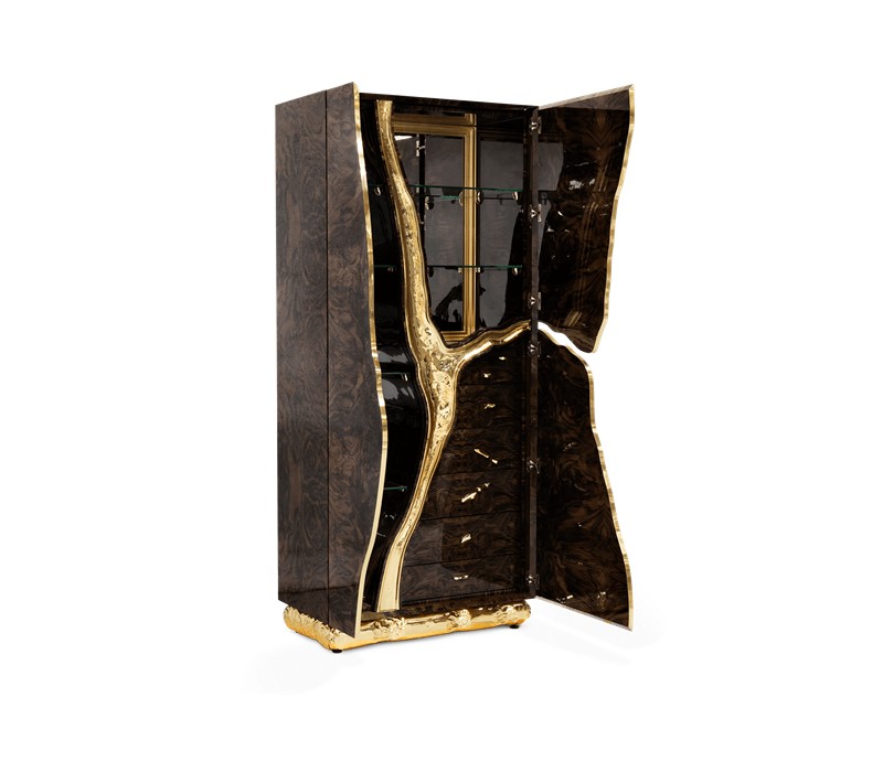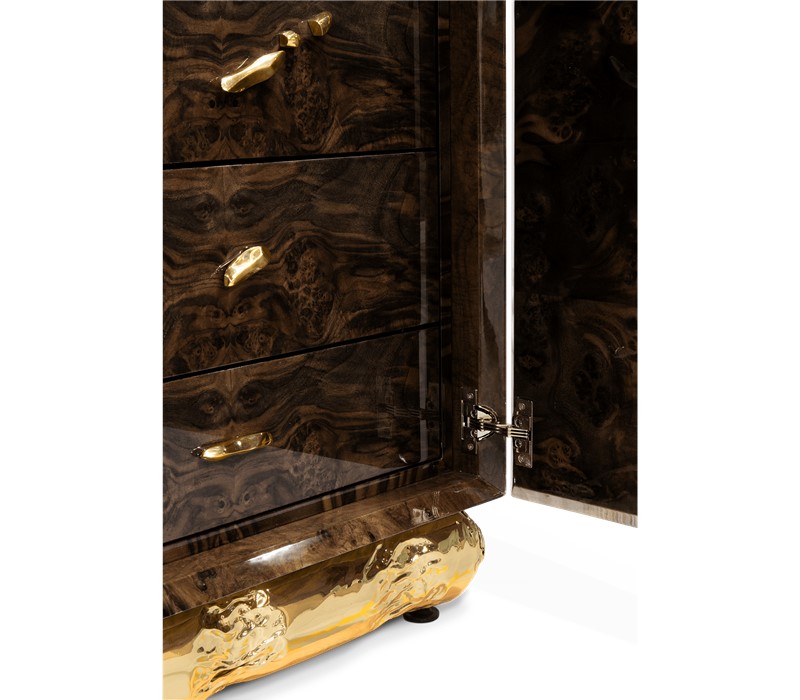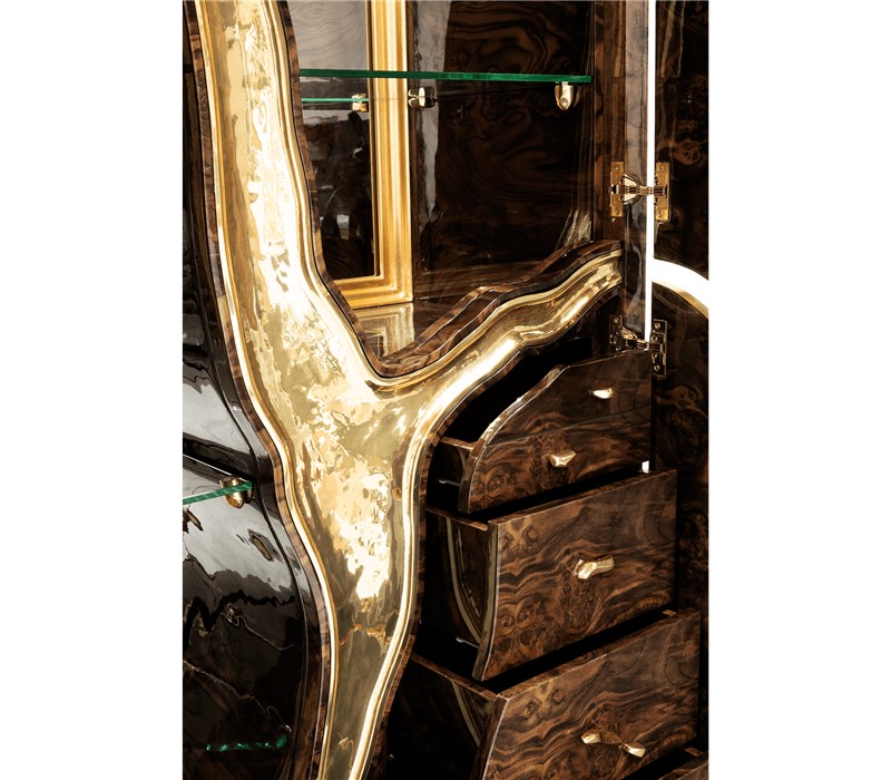 Coated exterior in walnut root veneer and gold finishes in hammered polished brass. Interior in Poplar Root & Polished Brass. Features 3 doors, 6 drawers, 6 glass shelves.