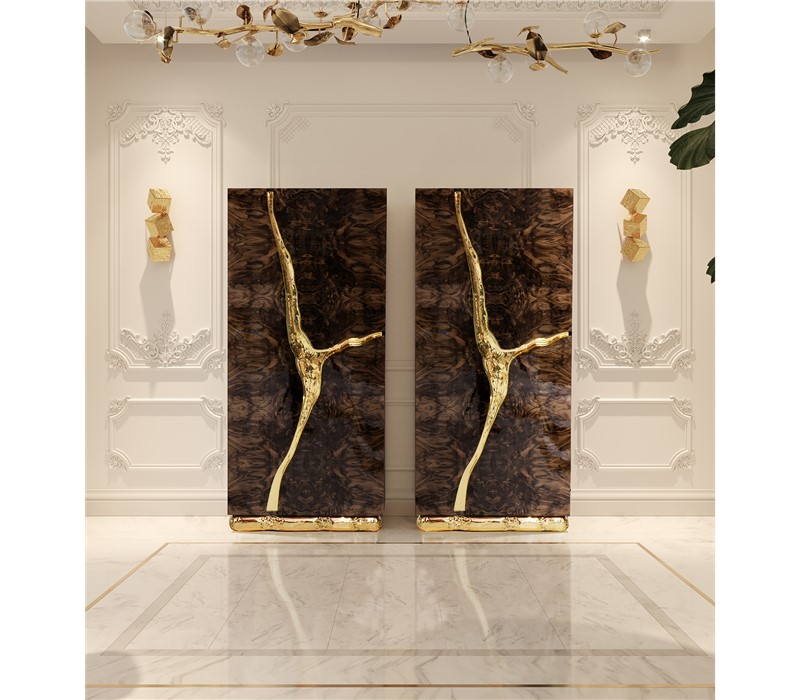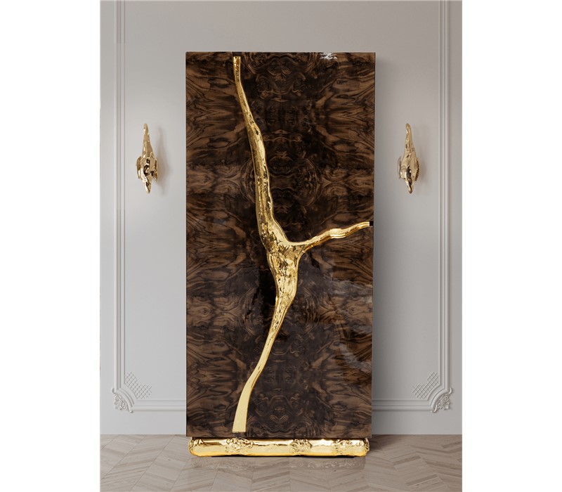 Lapiaz cabinet takes exceptional craftsmanship and design to a new realm. Finding beauty in the most unexpected places, this contemporary design piece is inspired by authentic karst formations. Its organic features are achieved through the manual fitting of polished brass, and a sharp finish in walnut wood veneer that portrays a perfect mirror. Different-shaped doors and drawer open to a distinct poplar root wood veneer interior. The hammered gold details and the mirrored façade conveys both dynamics and elegance, a beautiful duality between power and refinement to bring a new contemporary verve into interior design. A functional artwork piece born from cold and freshly cracked to showing off the world rich, golden details.