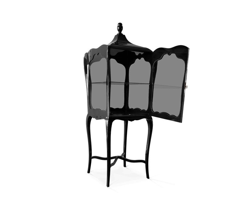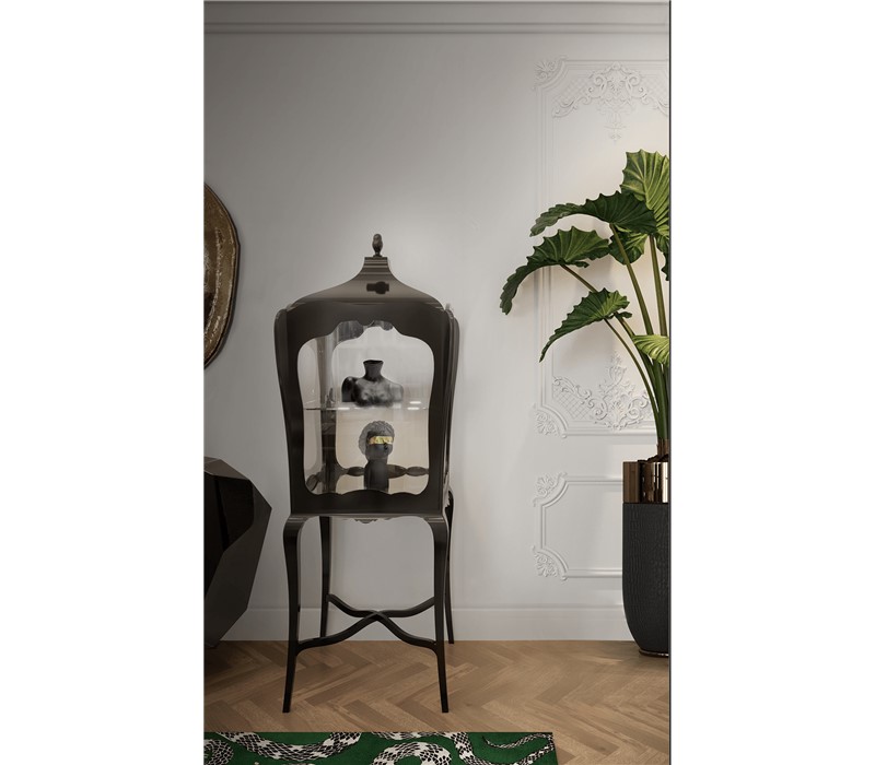 A reinterpretation of 17th-century French Style glass display cases of countryside Chateaux, the Palatino Slim Display Cabinet is an elegant storage piece whose lines easily capture the imagination and holds the best things in life. The black detailed frame is handcrafted in mahogany and supports four panels of clear glass. Behind its door that opens through a golden knob and closing switch, the interior boasts a single shelf in tempered glass. A versatile yet timeless case piece to showcase precious objects in different private homes or contract projects, from the most contemporary interior design rooms to the most classic interiors.