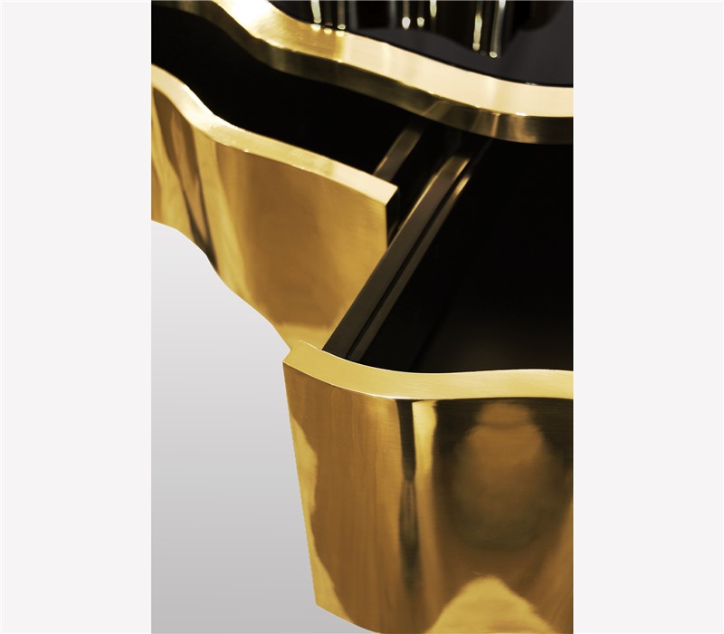 Sinuous is a vanity table designed with a modern and glamorous touch perfect for your bedroom or master bathroom set. Produced in wood, it is covered in black high gloss varnish and polished brass. It offers a lot of storage space, with four drawers on the top and five on the bottom, and a mirror accentuated by a gold plated rim. Its curved design will improve any bathroom design.