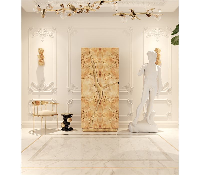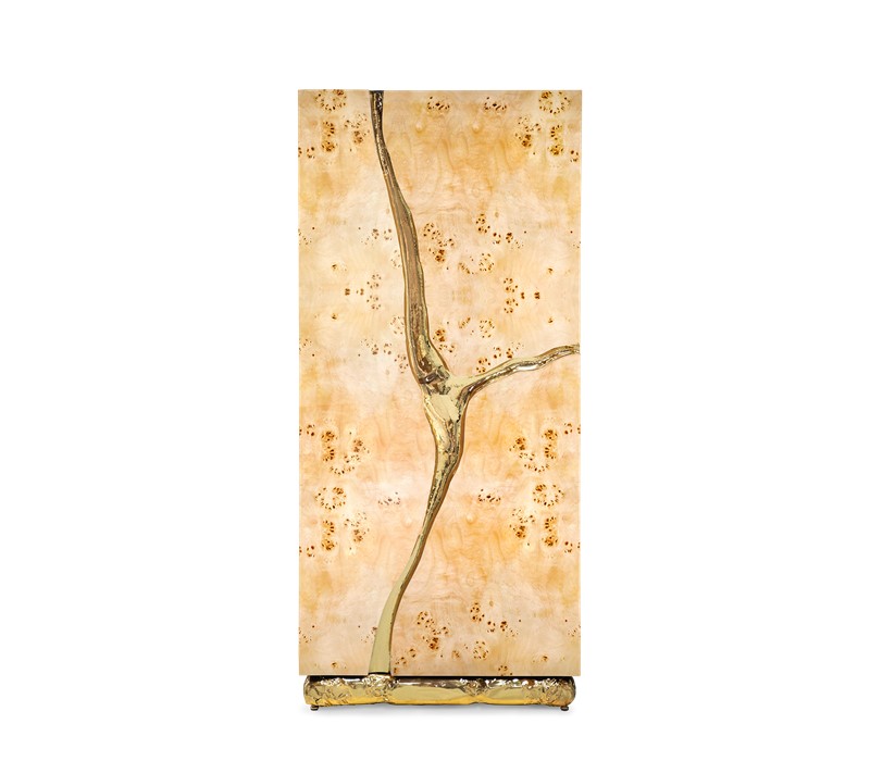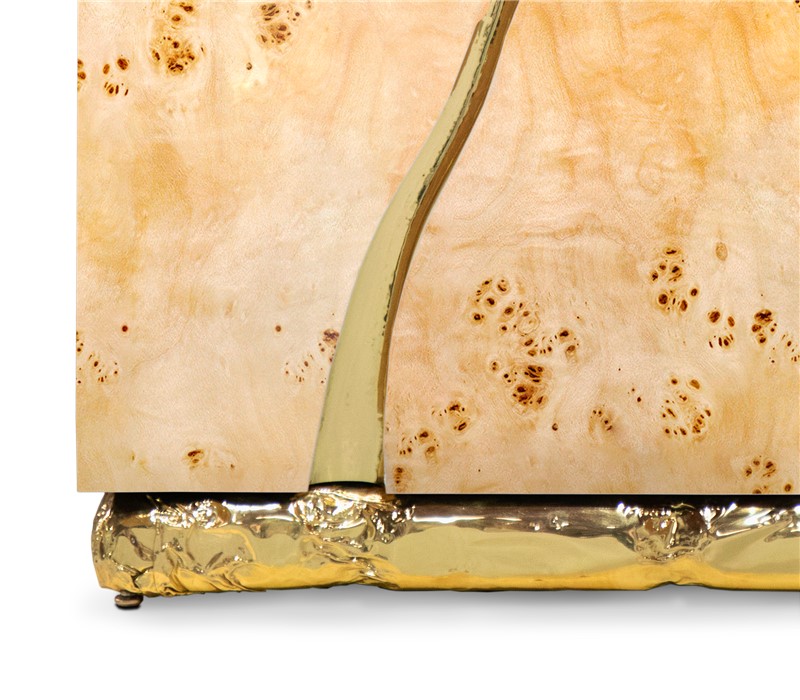 Coated exterior in poplar root veneer and gold finishes in hammered polished brass. Interior in Poplar Root & Polished Brass. Features 3 doors, 6 drawers, 6 glass shelves.