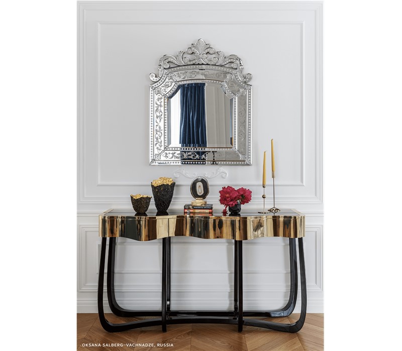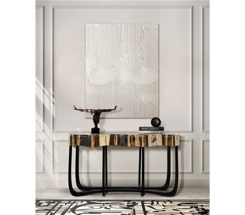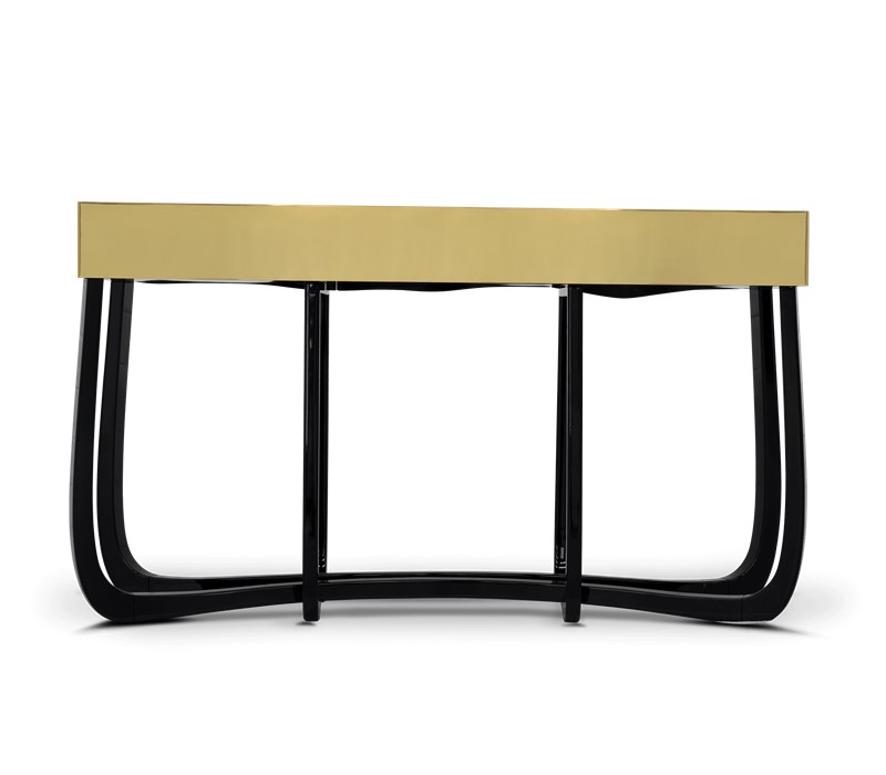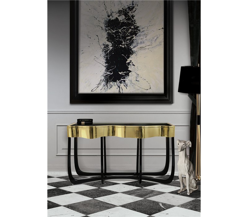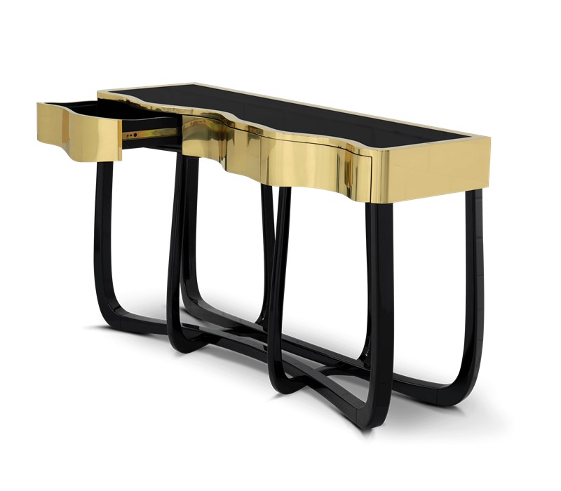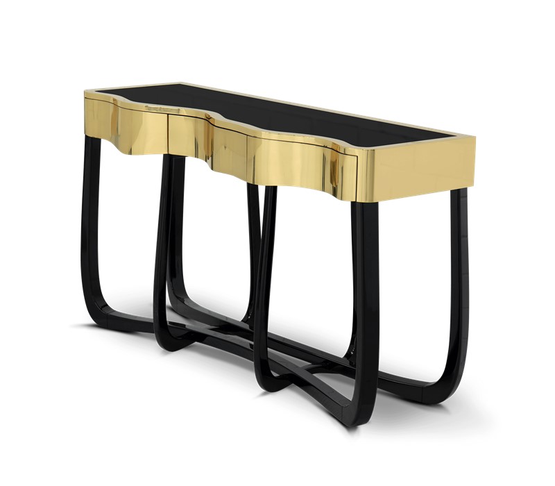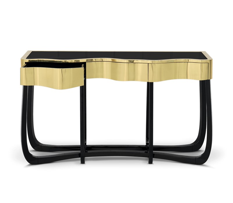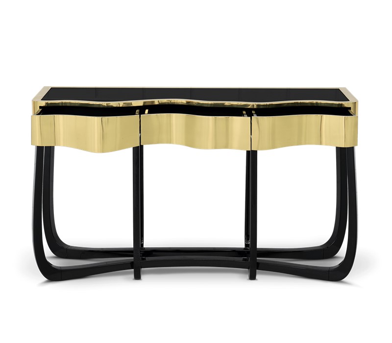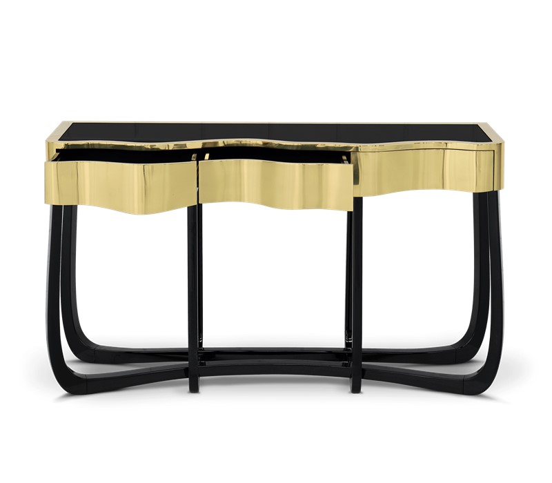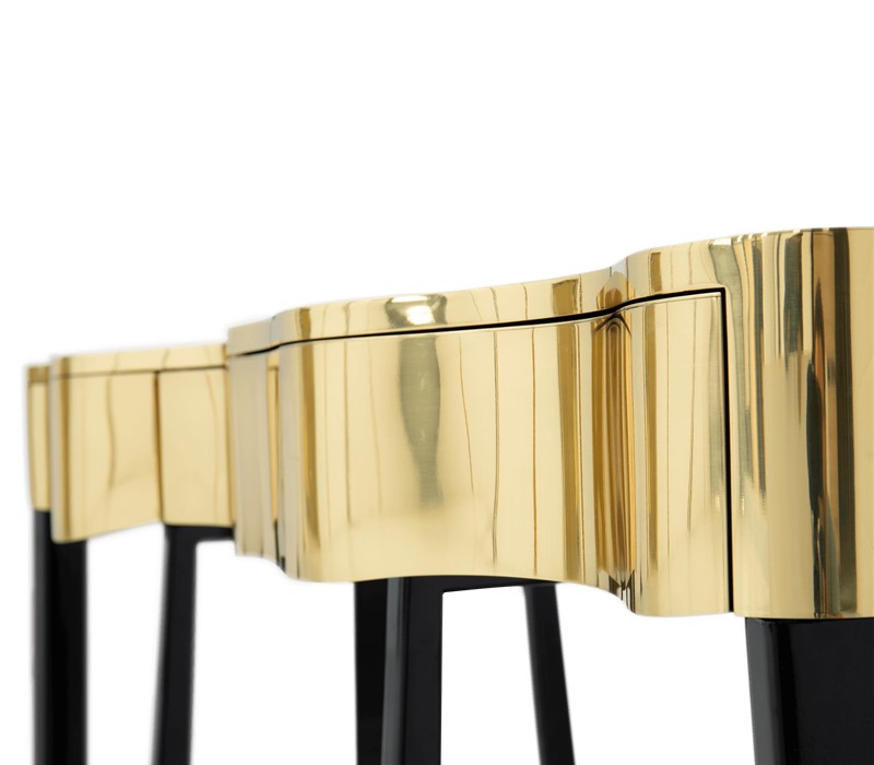 Boca do Lobo is an exclusive design furniture company that transcends the fusion of traditional and contemporary design. With Sinuous Patina Console you will successfully create a luxurious environment. Sinuous lines draw the elegant character of this console, gathering the styling of the best sellers of Coolors Collection. Sinuous is made for those who love harmonious lines mixed with exquisite detail. Its design is seductive and lures you into a magical and golden world. To achieve extravagance, Boca do Lobo’s artisans handcrafted the structure in mahogany with a high gloss black lacquer finish and top coated in polished brass plated, bringing up the vivid and bright side of Boca do Lobo. Contains three drawers.