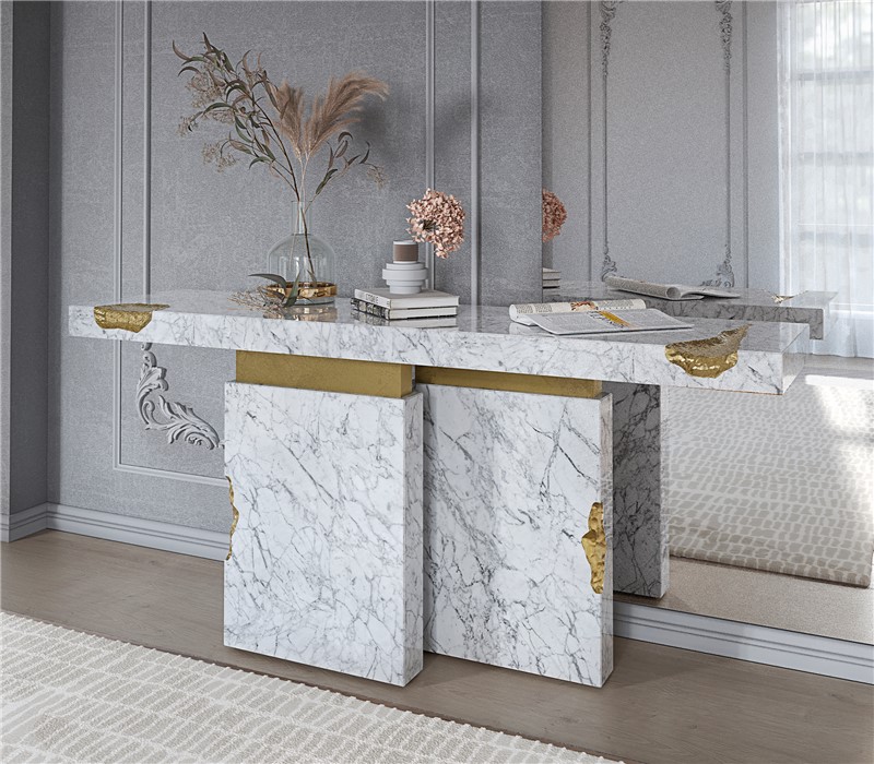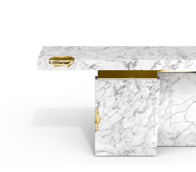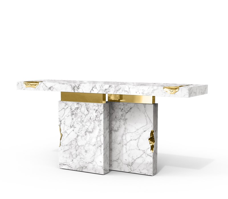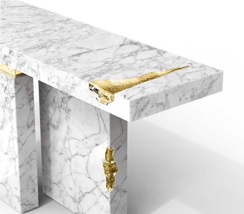 The Empire is a sublime console built in marble with polished brass details. Its cracks are hand-carved and inserted through polished brass sheets, which are hand-hammered for a unique finish. Designed to make an impression, this unique console is a unique masterpiece that will fit perfectly in exclusive entryways or hallways and empowering spaces. A refined statement piece made for those with refined minds and taste.