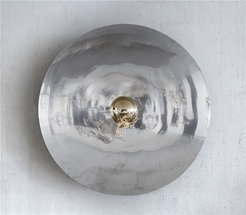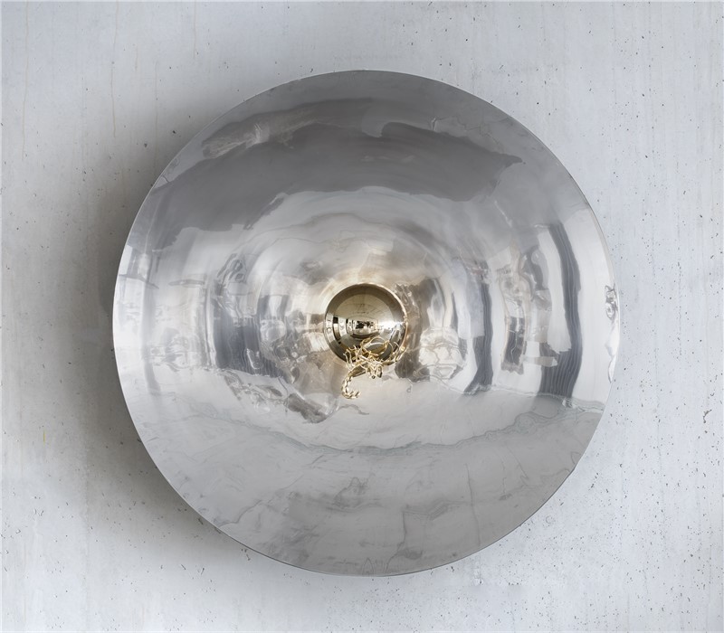Contemporary art imagined for those who appreciate the great things in life, finding beauty in the most unexpected places. Metamorphosis large round wall mirror is conceived with the concave shape of polished stainless steel and coated in a nickel bath. A restless yet sleek gold scorpion of casted brass raises in the centre, landed in a polished stainless steel semi-sphere encircled by a warm light. This statement wall decoration piece is born from the finest craftsmanship for the most exceptional rooms and remarkable interiors. A tribute to the darkest side of nature where challenges never cease to exist.