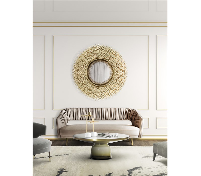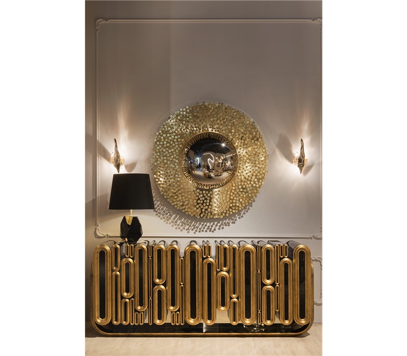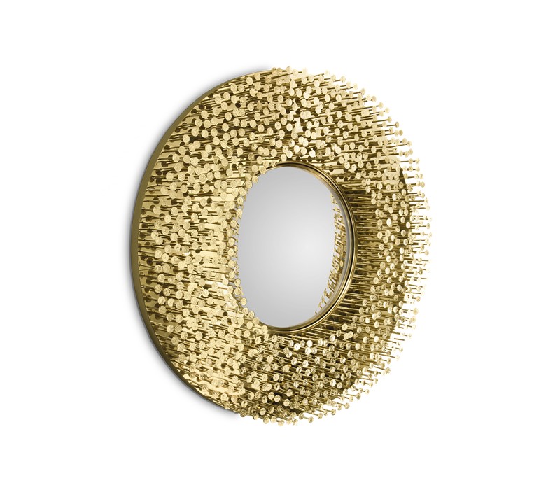 From the legend born in the depths of Sherwood Forest, ROBIN Mirror embodies the strength and character of noble ages, giving them a modern approach. By honoring the history of one of the best archers in English literature, this wall mirror was given a strong visual texture through the use of handmade nails, each one unique in its finishing, size and character. The fish-eye mirror is supported by a brass structure that turns ROBIN into one of the most emblematic pieces of the entire collection.