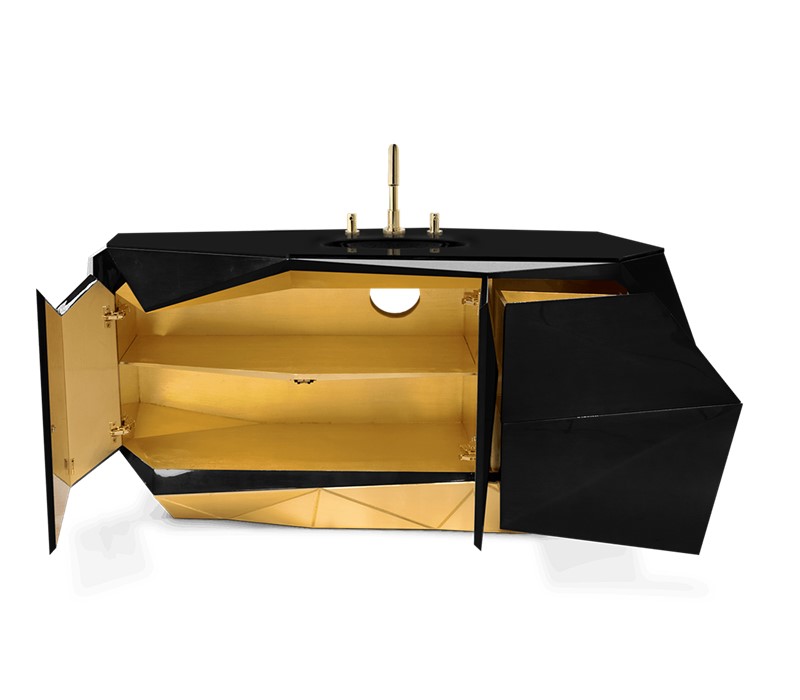 The Diamond Single Vanity Cabinet turns heads wherever it stands. It features a wooden structure finished in a high gloss black varnish, a color that contrasts perfectly with its interior, covered in gold leaf. This beautiful item has a built-in oval sink glass with a translucent black finishing that will add incredible luxury to any bathroom design.