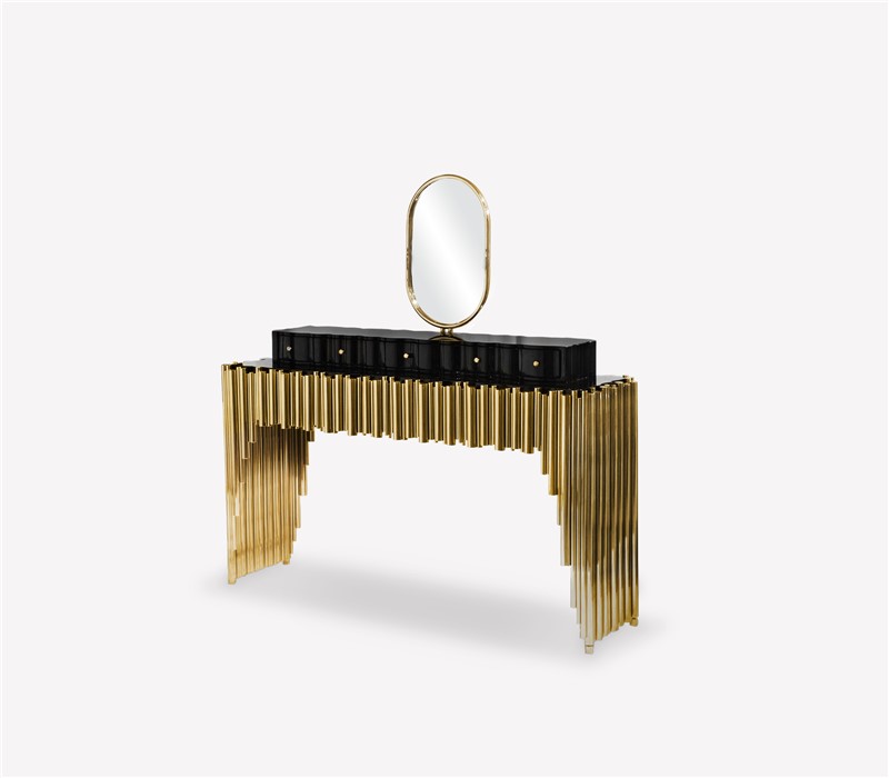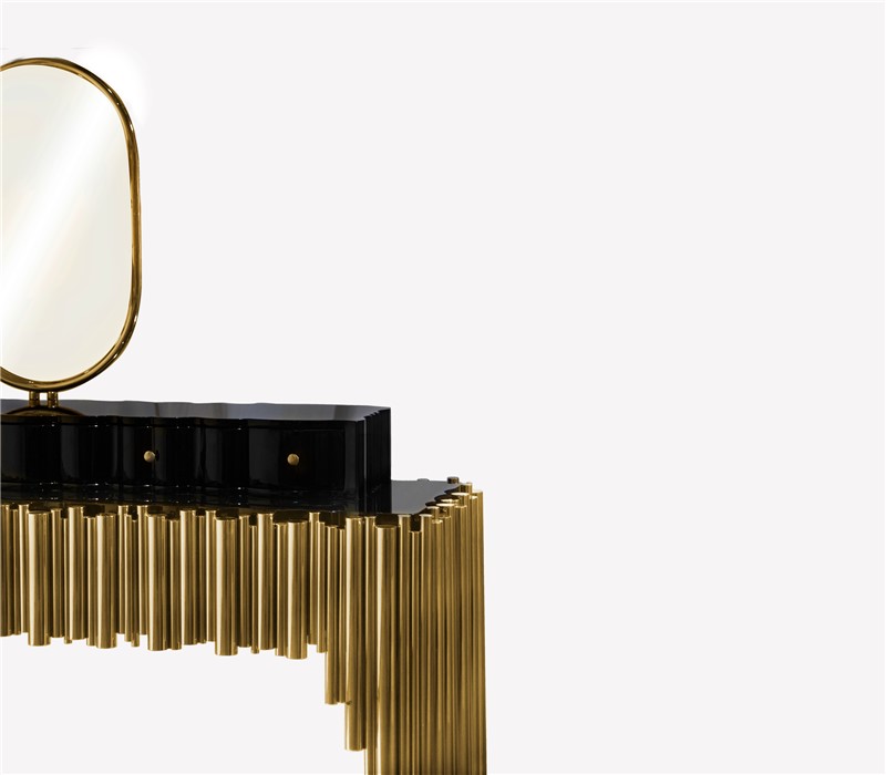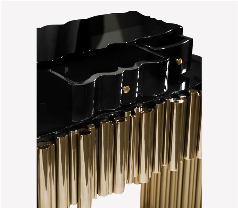 The Symphony Vanity Table draws inspiration from church organ tubes, as well as the curves of a violin. It features a cluster of polished brass tubes that envelopes an exotic wood structure and a serpentine front and countertop produced in wood and lacquered in a high gloss black. This is an Item that is perfect for your bathroom interior.