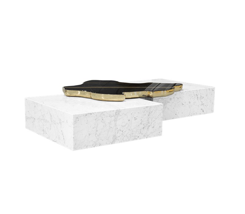 The design of Navarra modern center table captures unique Spanish warmth and finest craftsmanship. The rich colour background set off by thick and thin veins alike carries the eyes to the top of this table, framed by brass. Taking inspiration from its homeland, the Navarra coffee table brings an elegant flair into your home decoration. It is a contemporary center table composed by two square marble modules, linked by an organic marble surface element on top enveloped by casted brass. An exclusive design piece and polished choice for luxury home interiors.