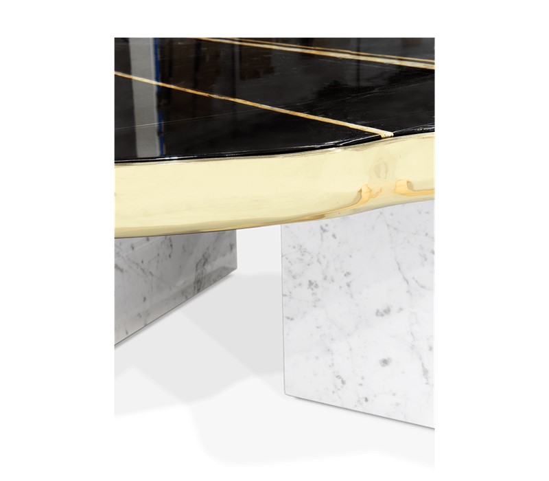 A contemporary center table composed by two square marble modules, linked by an organic marble surface element on top enveloped by casted brass.