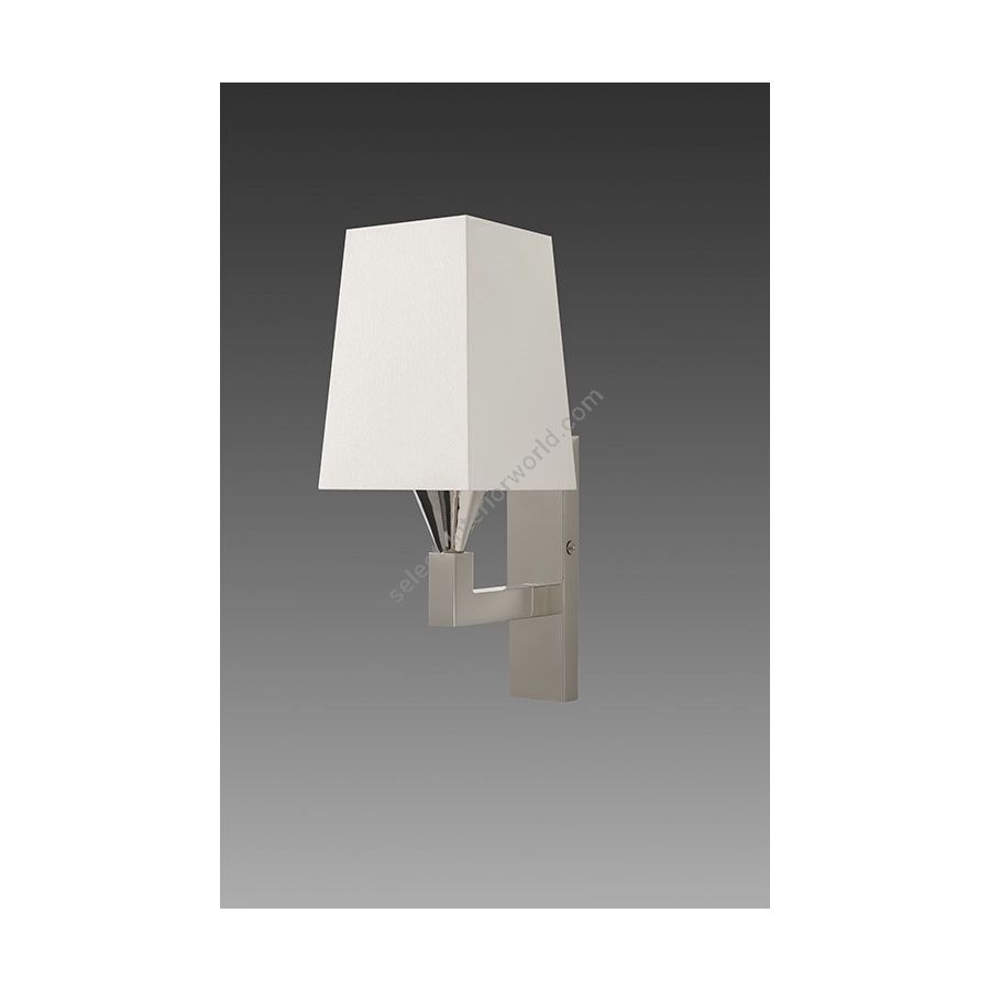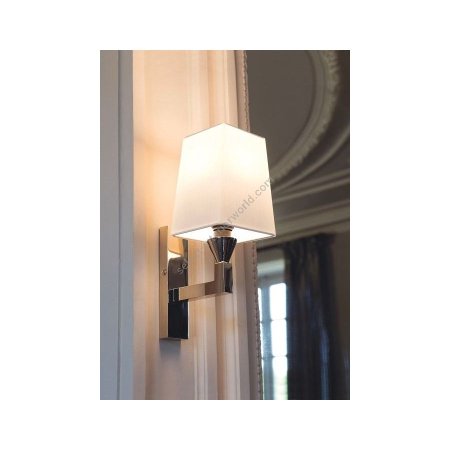 Wall light made in brass. Made with a fixed arm on a thin rectangular base. This simple and elegant wall light discretely fits into your interior. Available in black or matt gold patina, and in nickel or brushed nickel. Presented lamp shade in white cotton chintz in a tapered rectangular shape (see other available shapes and colours)