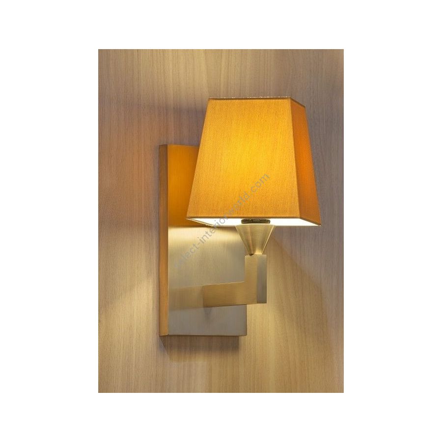 Wall light made in brass. Made with a fixed arm on a large rectangular base. This simple and elegant wall light discretely fits into your interior. Available in black or matt gold patina, and in nickel or brushed nickel. Presented lamp shade in white cotton chintz in a pyramidal shape (see other available shapes and colours)