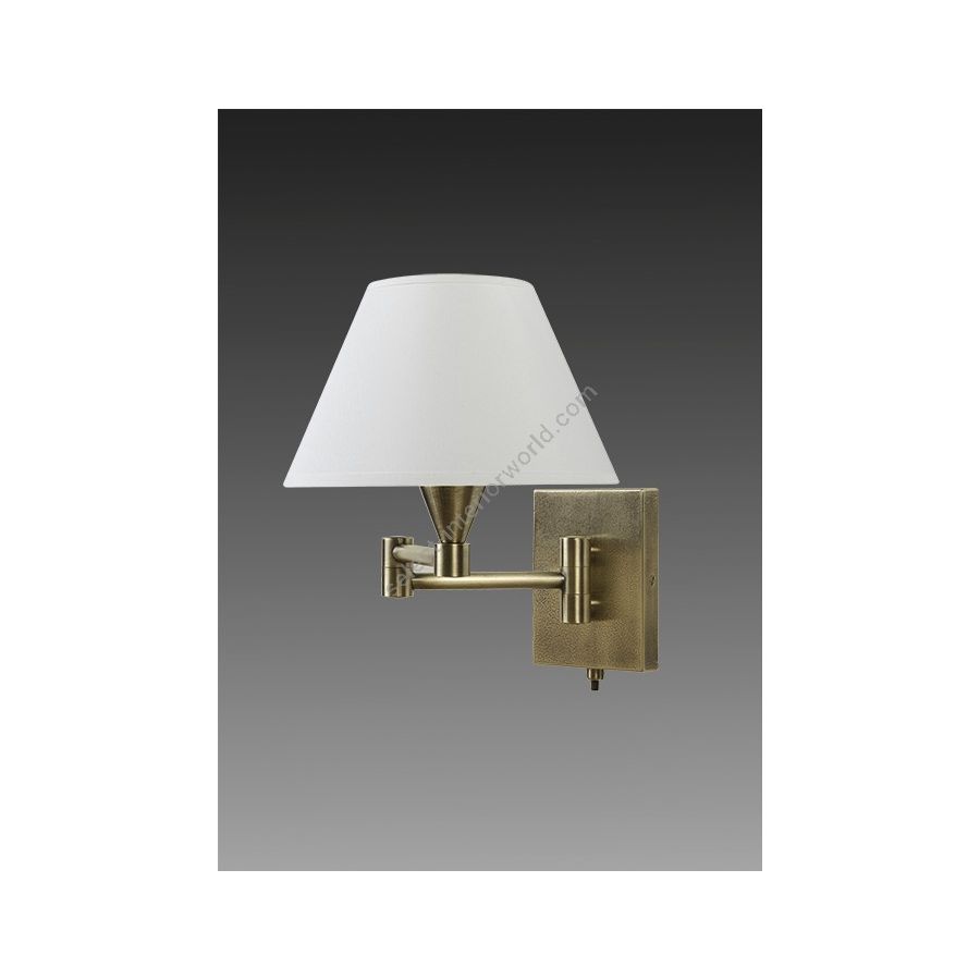Wall light made in brass. Made with a double swing arm on a rectangular base with switch. This classical wall light gives a nice light next to bed. Available in black or matt gold patina, and in nickel or brushed nickel. Presented lamp shade in white cotton chintz in a conical shape (see other available shapes and colours)