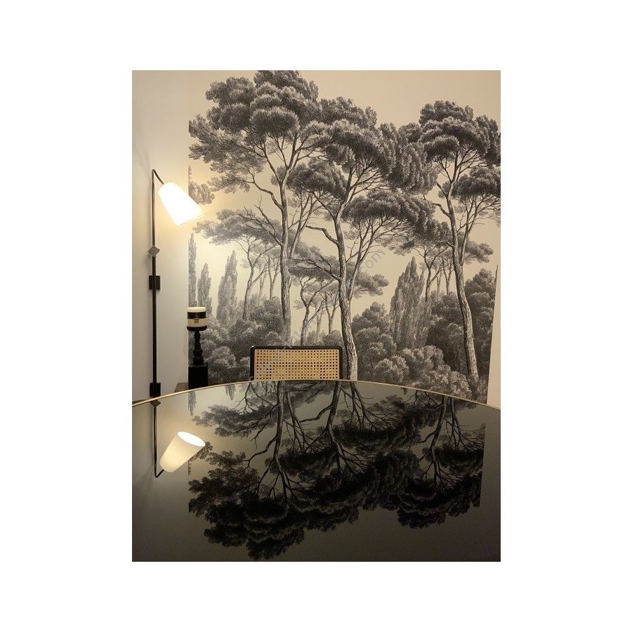 Long wall light made in brass. Made with a round telescopic tube with a flexible arm on 2 square bases. This original wall light gives a nice light next to bed. Available in black or matt gold patina. Presented lamp shade in white cream cotton chintz in a conical shape (see other available shapes and colours)