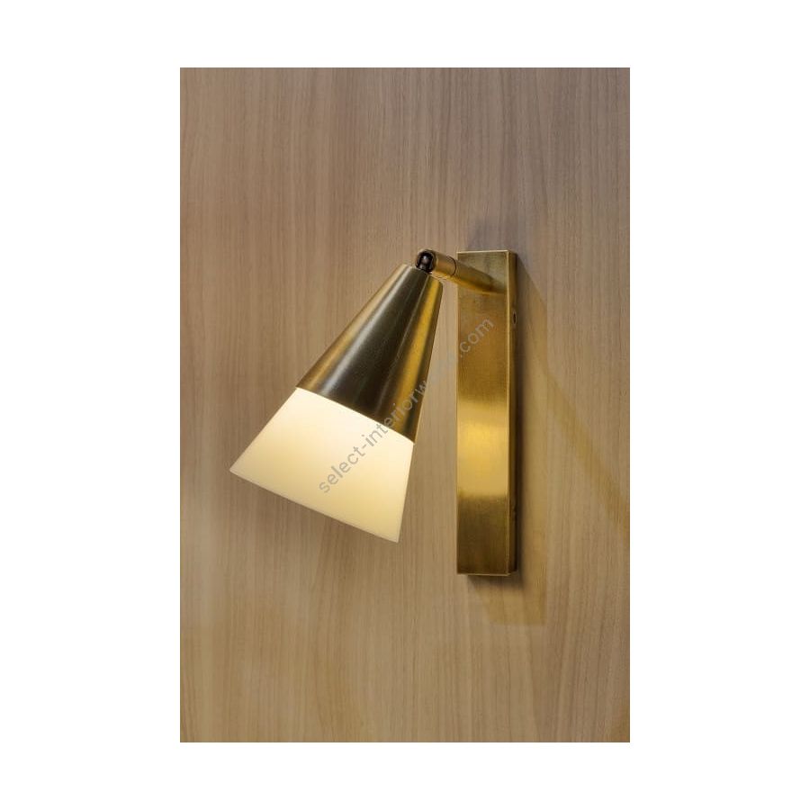 Wall light made in brass. Made with a round tube and a cone on a rectangular base. This contemporary wall light gives a particular light thanks to the frosted glass reflector (supplied). Available in black or matt gold patina
