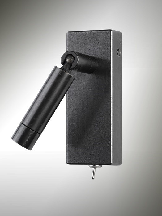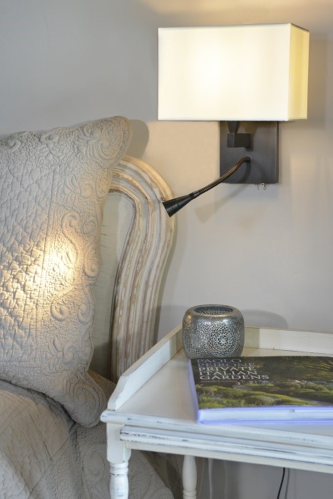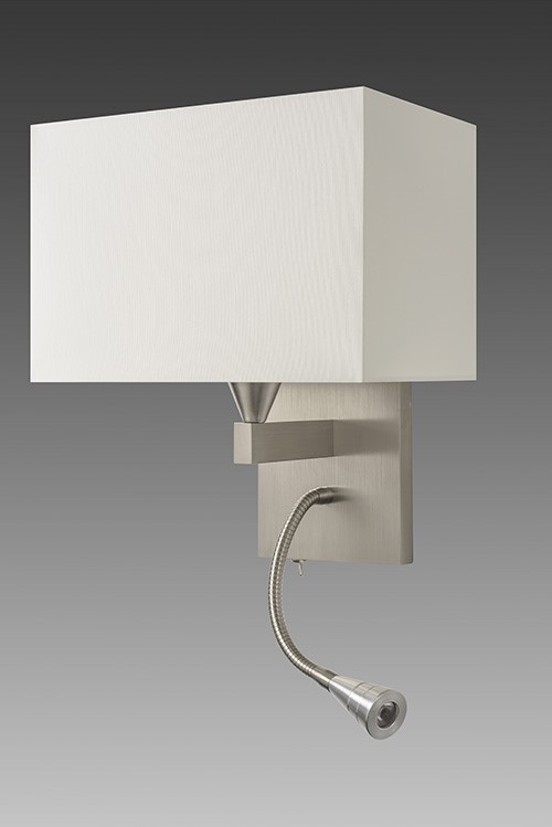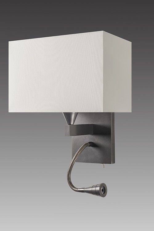 Wall light with Led light made in brass. Made with a fixed arm on a rectangular base and a Led light, on a 20cm flex with switch. This elegant wall light gives an ambiance or direct light. Possibility of a second switch on demand. Available in black or matt gold patina, and in nickel or brushed nickel. Presented lamp shade in white cotton chintz in a rectangular shape (see other available shapes and colours)
