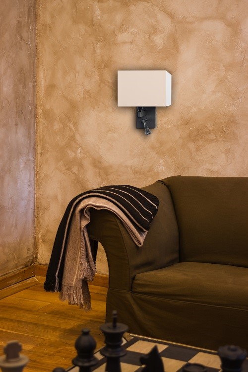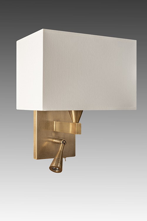 Wall light with Led light made in brass. Made with a fixed arm on a rectangular base and a Led light, on a kneecap with switch. This elegant wall light gives an ambiance or direct light. Possibility of a second switch on demand. Available in black or matt gold patina, and in nickel or brushed nickel. Presented lamp shade in white cotton chintz in a rectangular shape (see other available shapes and colours)