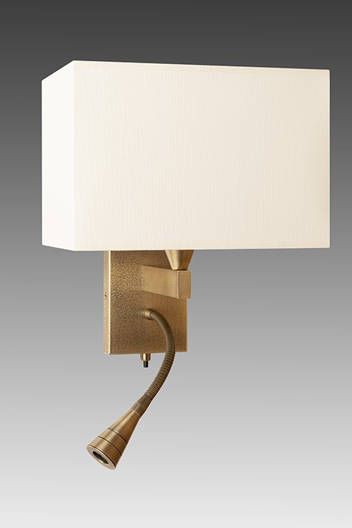 Wall light with Led light made in brass. Made with a fixed arm on a small rectangular base and a Led light, on a 20cm flex with switch. This elegant wall light gives an ambiance or direct light. Possibility of a second switch on demand. Available in black or matt gold patina, and in nickel or brushed nickel. Presented lamp shade in white cotton chintz in a rectangular shape (see other available shapes and colours)