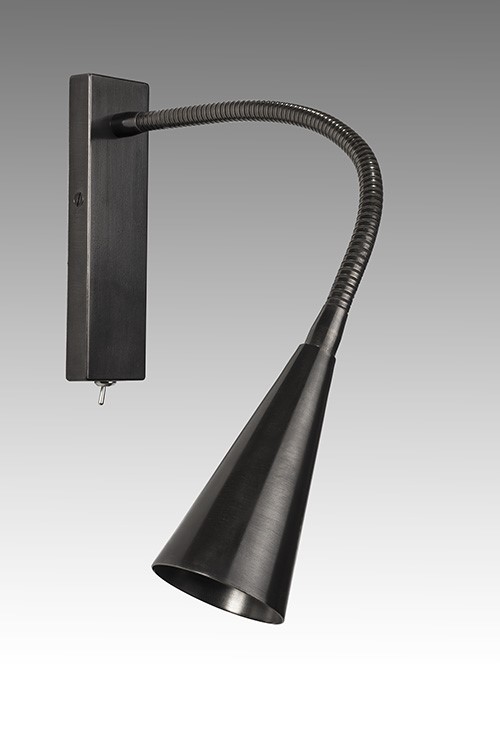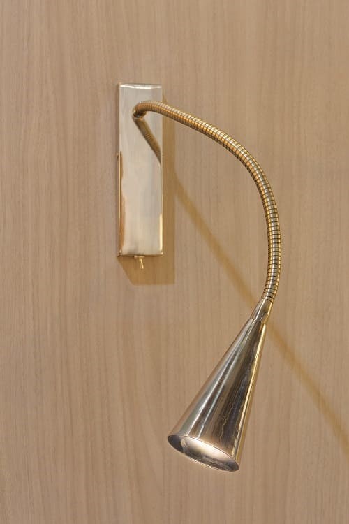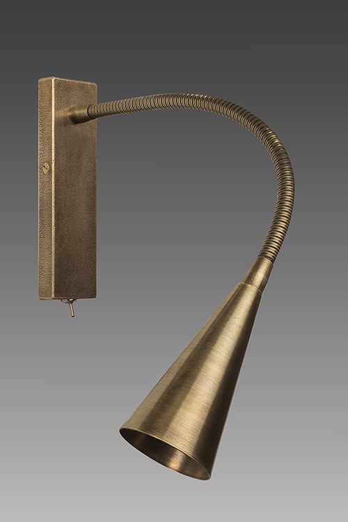 Wall light with Led light made in brass. Made with a 30cm flex on an embedded rectangular base. This reading wall light gives a sober and elegant design, and an efficient direct light. Available in black or matt gold patina, and in nickel or brushed nickel
