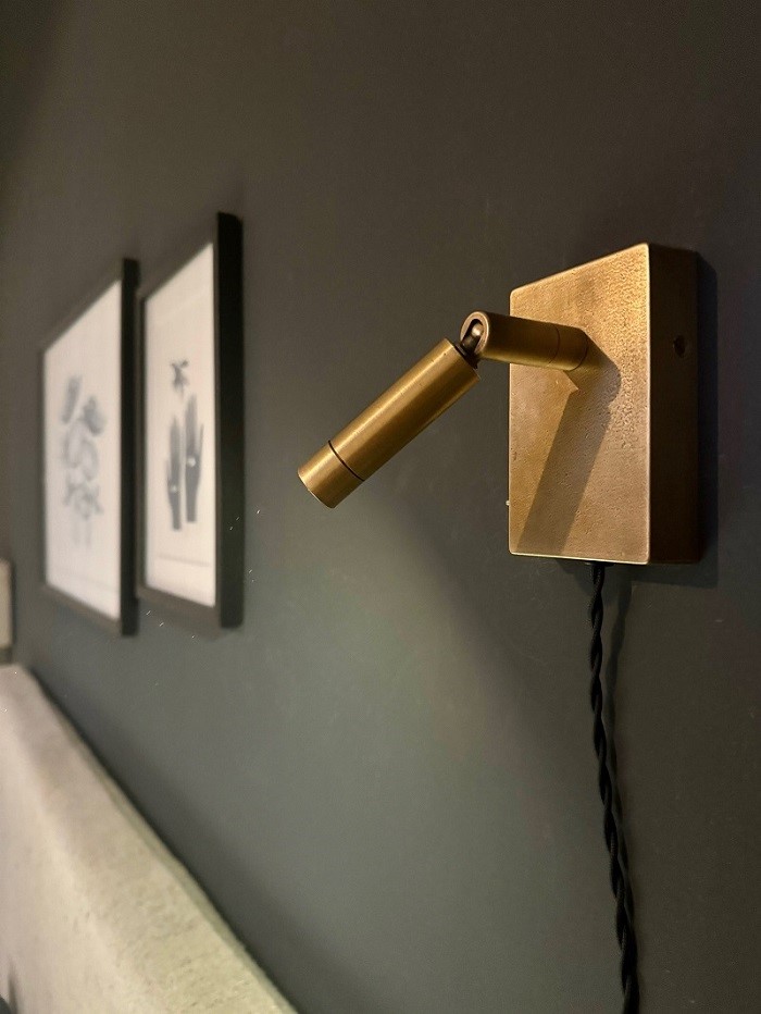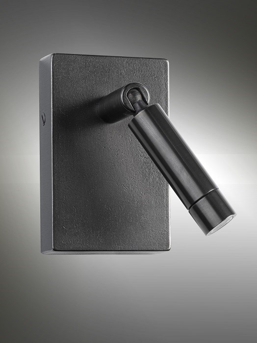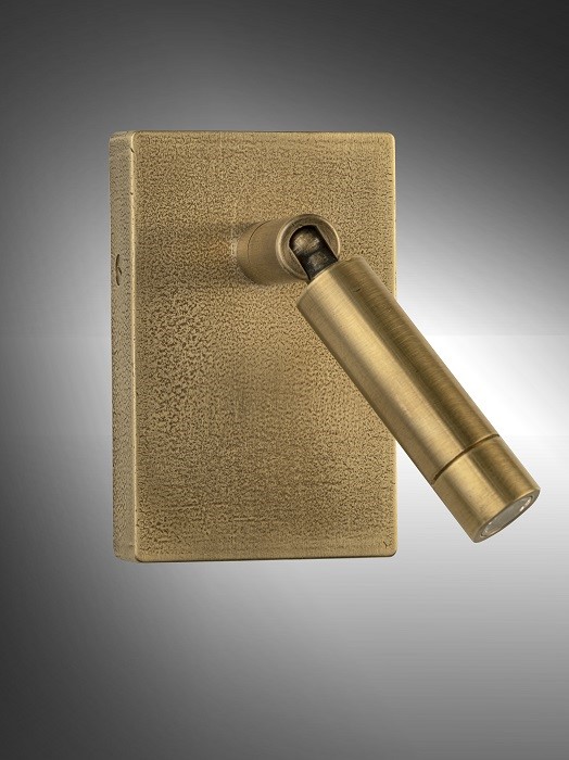 Wall light with Led light made in brass. Made with a led head fixed with a rotating kneecap, on a rectangular base without switch. This reading wall light gives a sober and elegant design, and an efficient direct light. Available in black or matt gold patina, and in nickel or brushed nickel