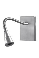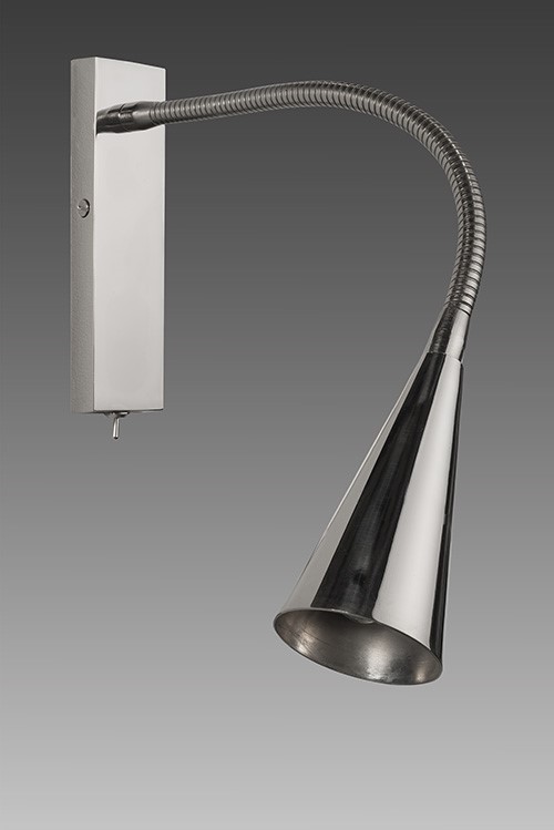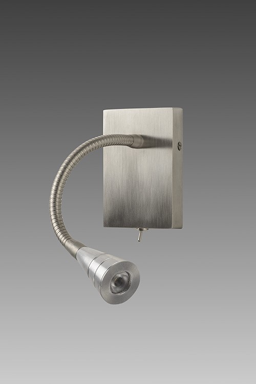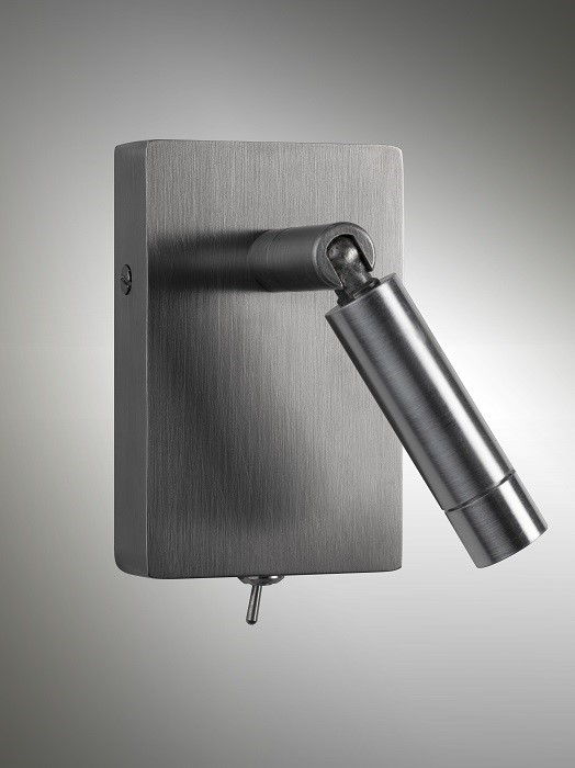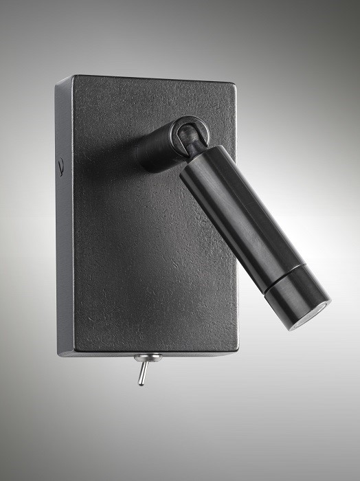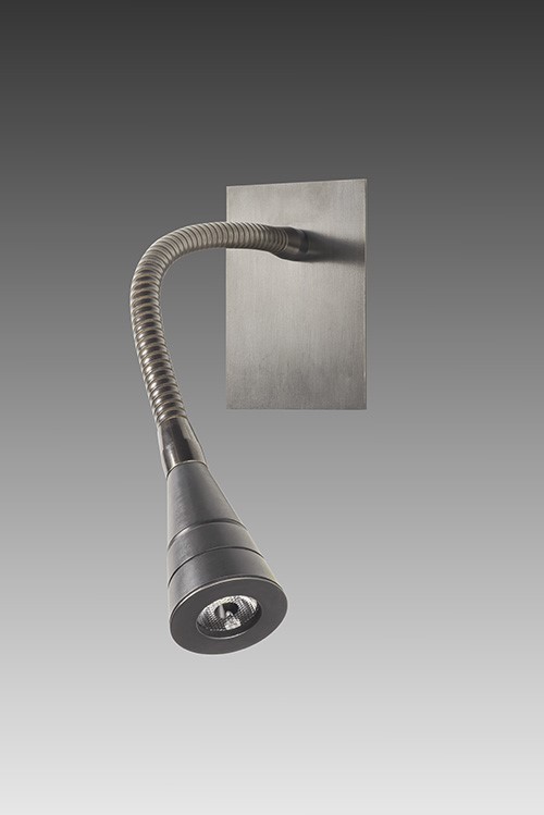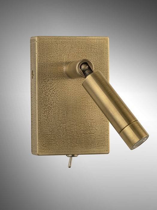 Wall light with Led light made in brass. Made with a led head fixed with a rotating kneecap, on a rectangular base with switch. This reading wall light gives a sober and elegant design, and an efficient direct light. Available in black or matt gold patina, and in nickel or brushed nickel