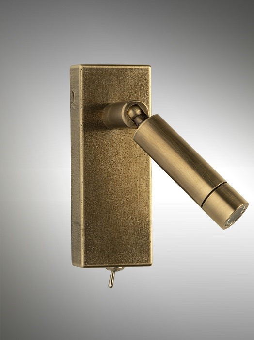 Wall light with Led light made in brass. Made with a led head fixed with a rotating kneecap, on a rectangular base with switch. This reading wall light gives a sober and elegant design, and an efficient direct light. Available in black or matt gold patina, and in nickel or brushed nickel