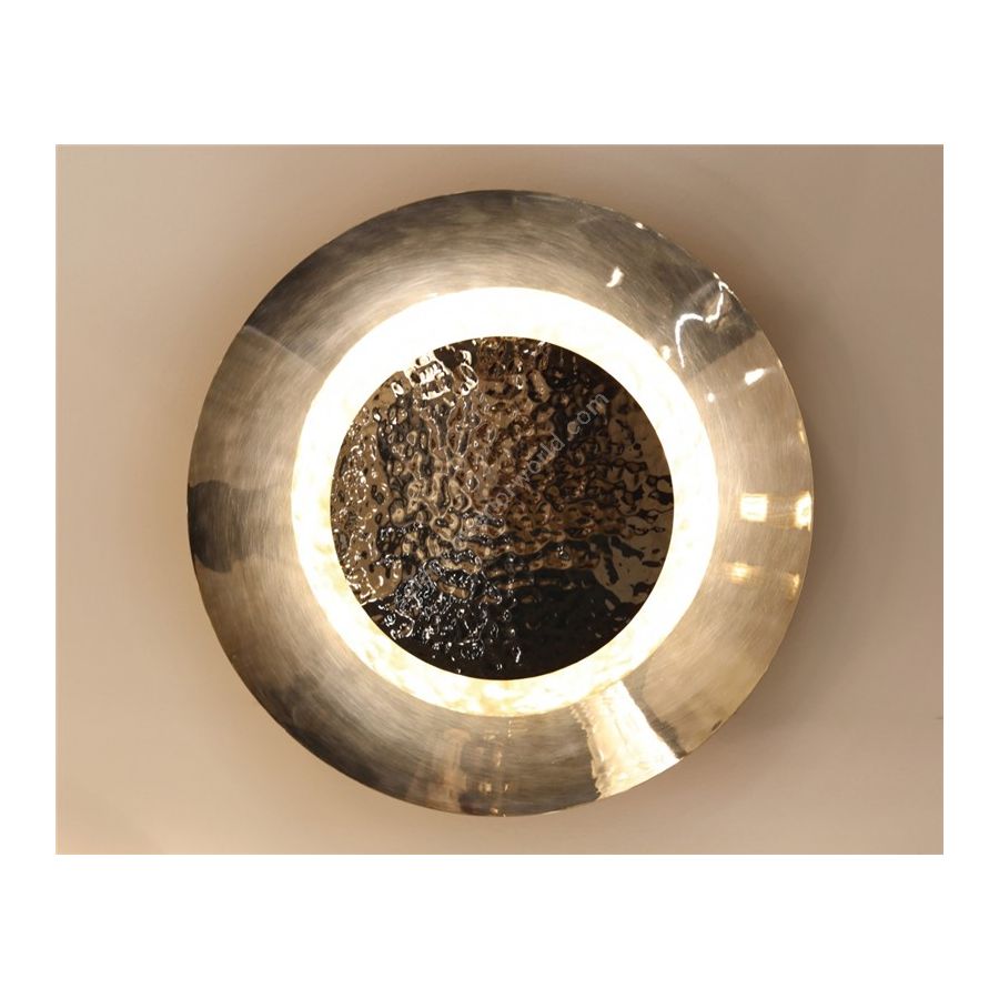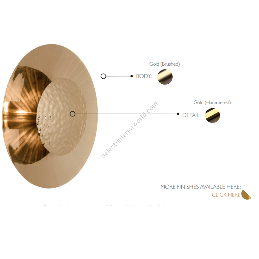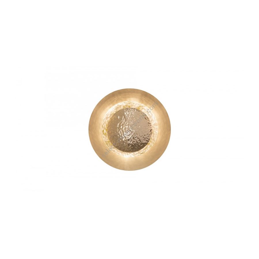 Die goldene Wandleuchte Eclipse bildet dieses Naturwunder nach und besteht aus zwei abgerundeten Messingplatten, die mit etwas Abstand voreinander platziert sind, so dass nur kleine Lichtsicheln hindurchscheinen. Die vordere Platte wird mit modernen Handwerkstechniken von Hand gehämmert, was sich in der glänzenden vergoldeten Platte auf der Rückseite widerspiegelt.