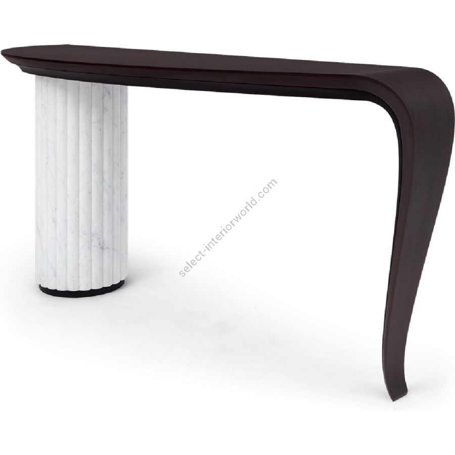 Eine malerische Verzierung aus handgeschnitztem Holz bildet die elegante Platte und das Bein dieses spektakulären, länglichen Konsolentisches. Die Stütze besteht aus einer dorisch inspirierten Säule, die meisterhaft mit den klassischen vertikalen Rippen aus Nero Marquina- oder weißem Carrara-Marmor gefertigt wurde.