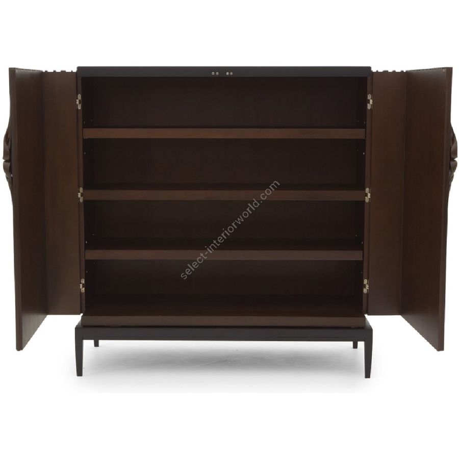 Dieses außergewöhnliche Design besticht durch eine kunstvoll geschnitzte, geriffelte Front, ergänzt durch Christopher Guys charakteristisches handgeschnitztes Knotenmuster. Im Inneren befinden sich drei Regale hinter zwei geschlossenen Türen.