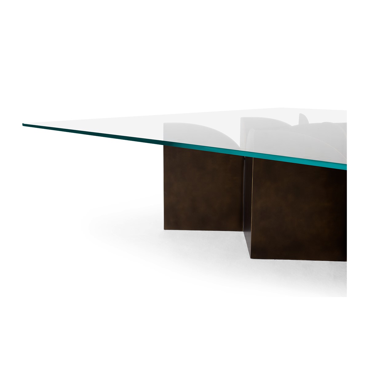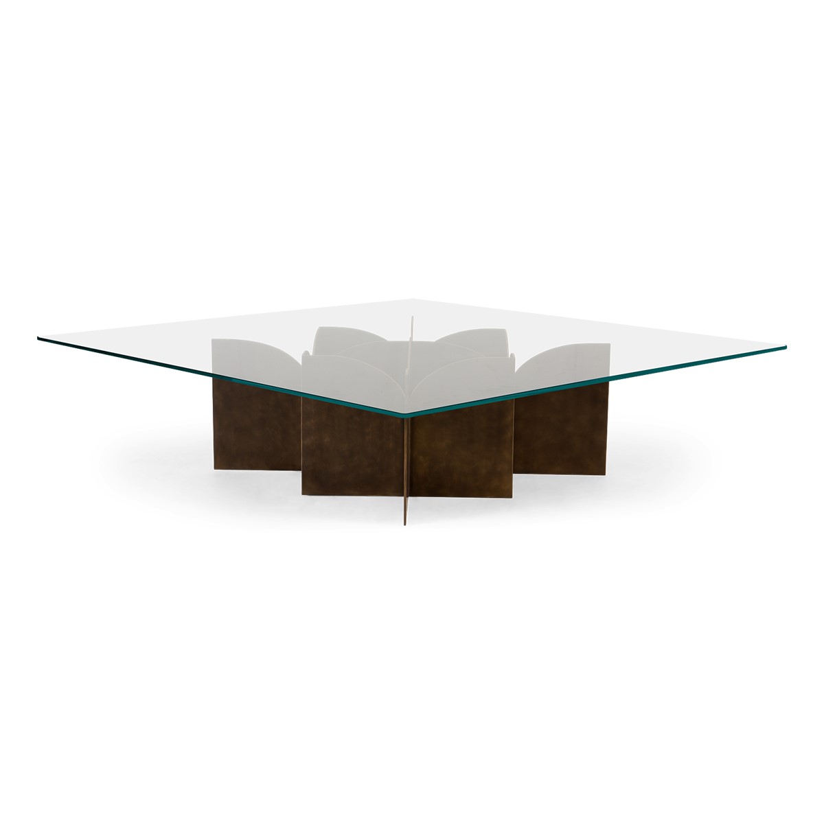 Industrial chic takes on a luxe look with this striking square coffee table. The geometric formed base is in forged iron and is topped with clear tempered class.