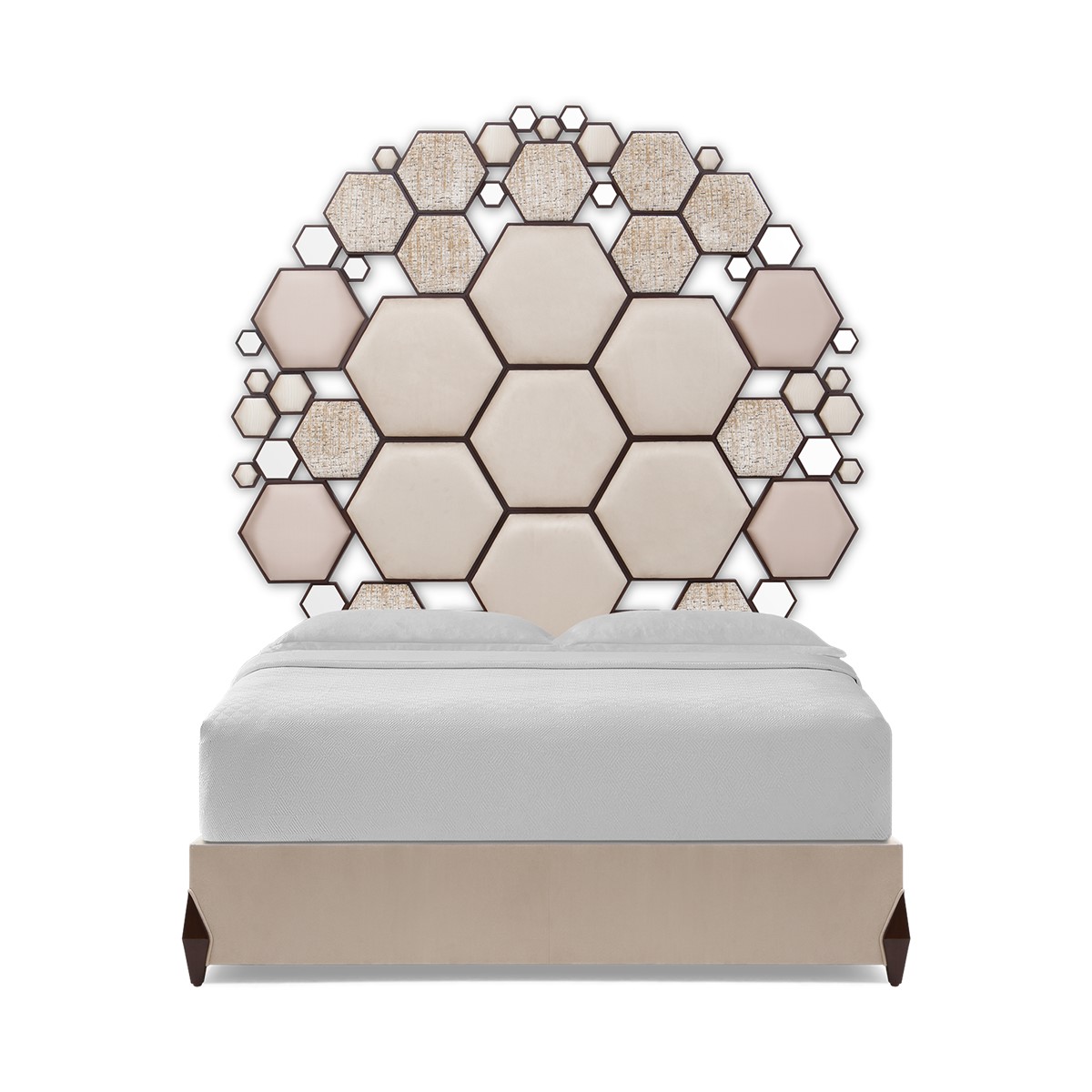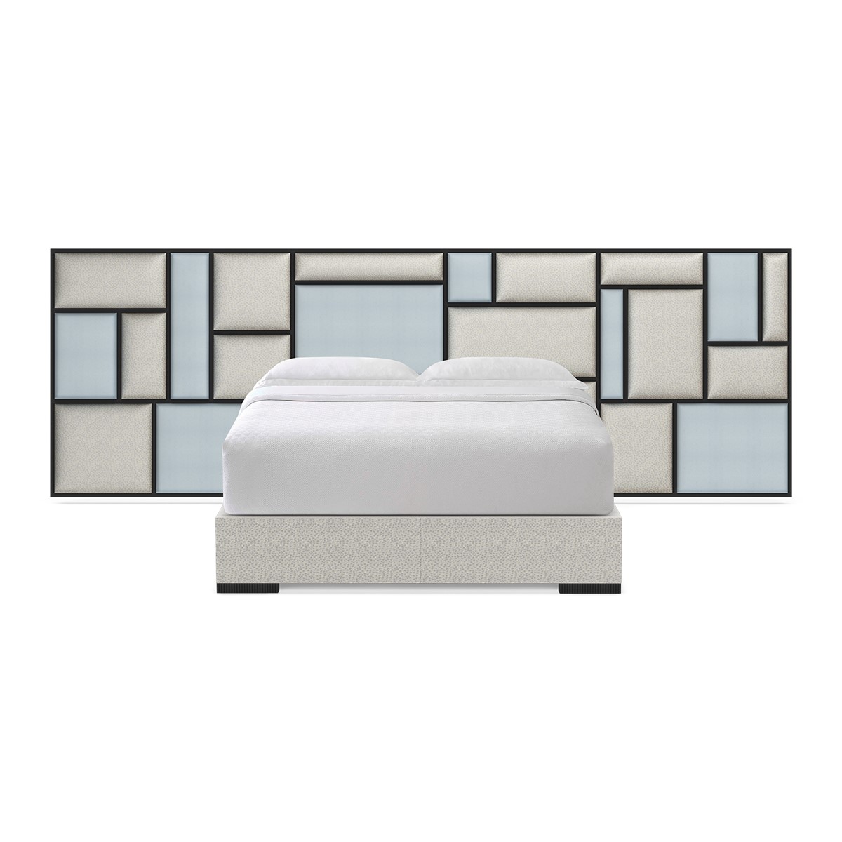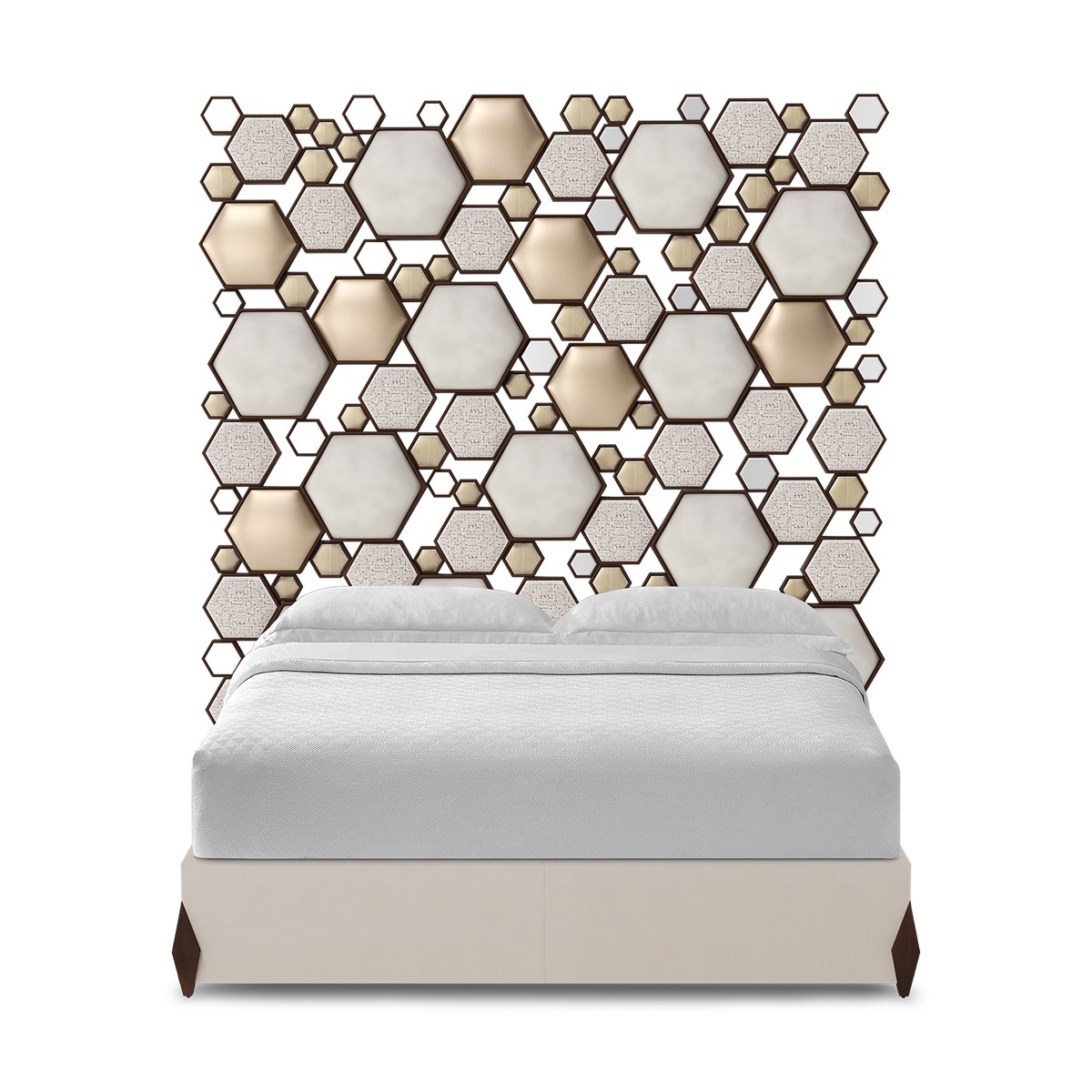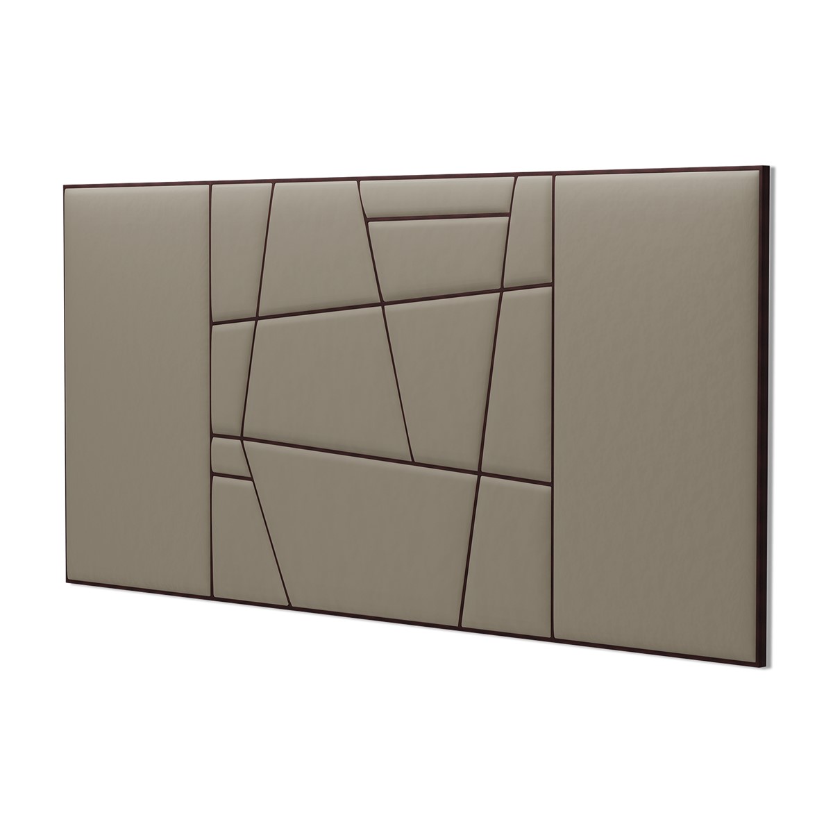 An elegant and hypnotic 3-panel headboard, designed with 15 upholstered panes in irregular geometric shapes that fit into a central square panel with two plain upholstered side panels, suitable for all bed sizes. Also available in a narrow version (20-0789) and high version (20-0790).