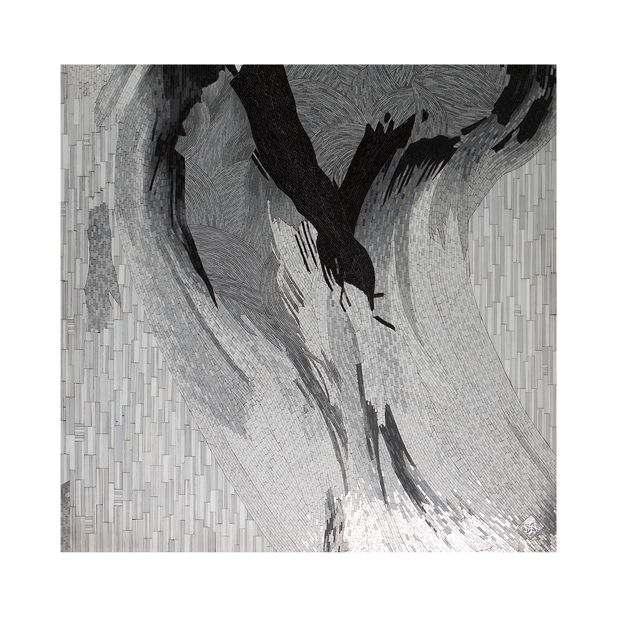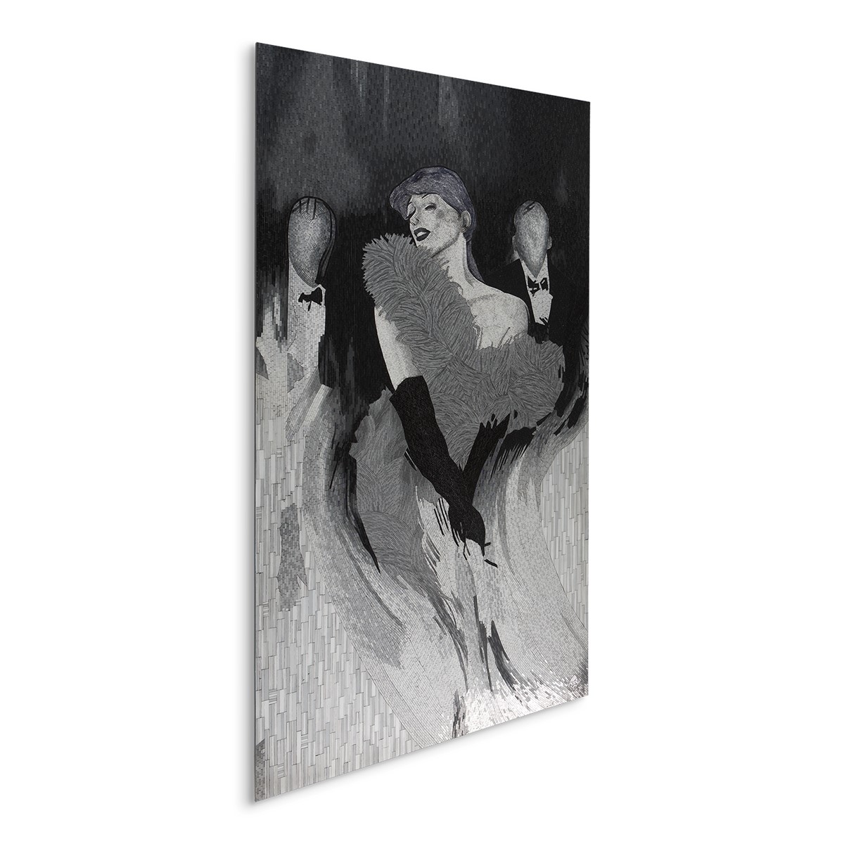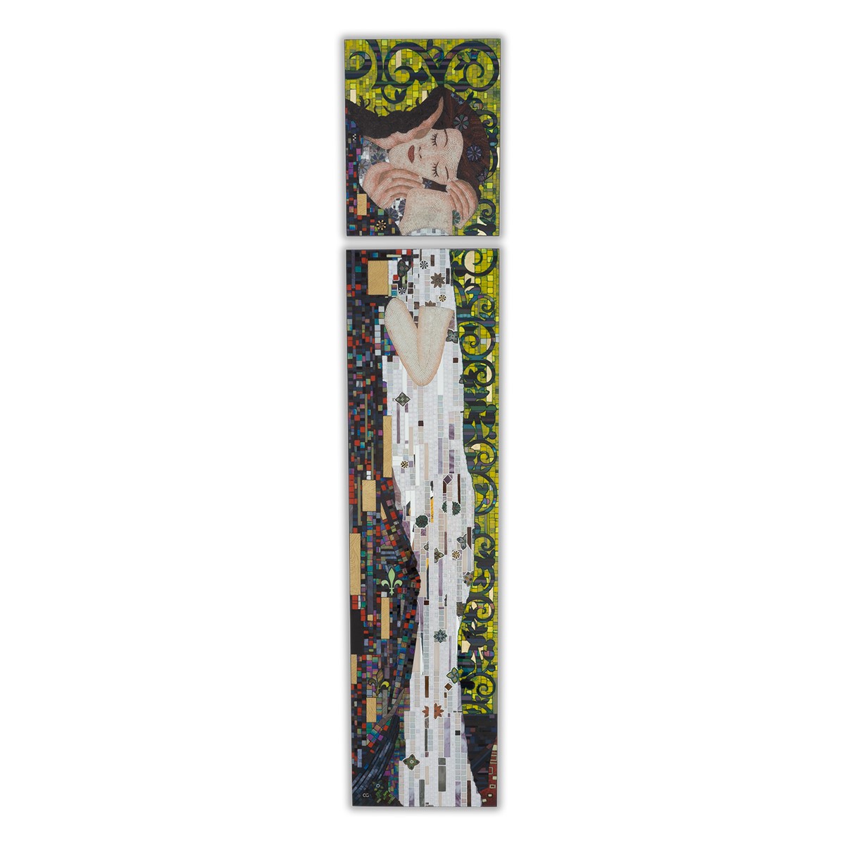 Wall mounted French cleat hanging system. Mosaic inlay of the highest quality, comprising of thousands of hand-cut and individually monochrome glass pieces.