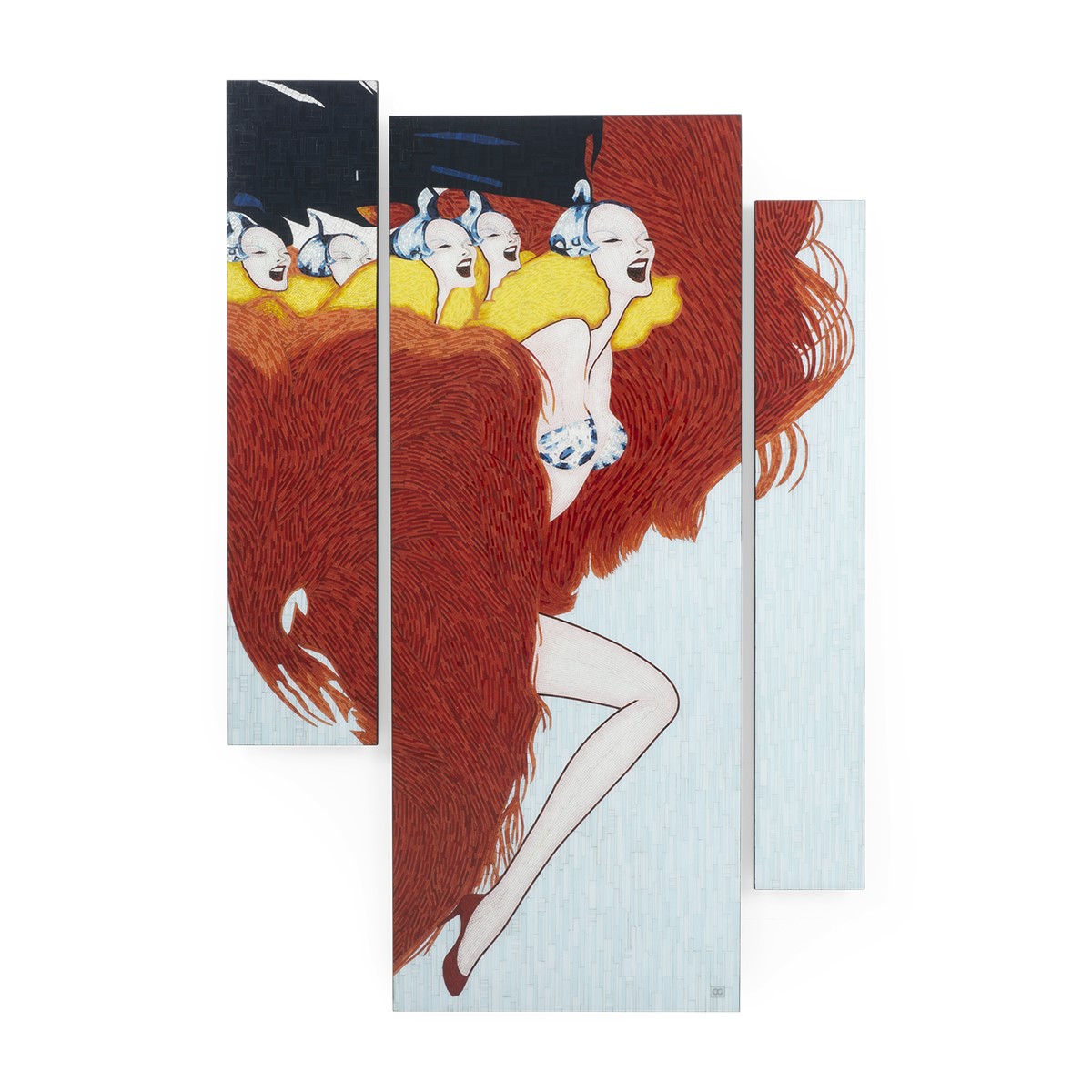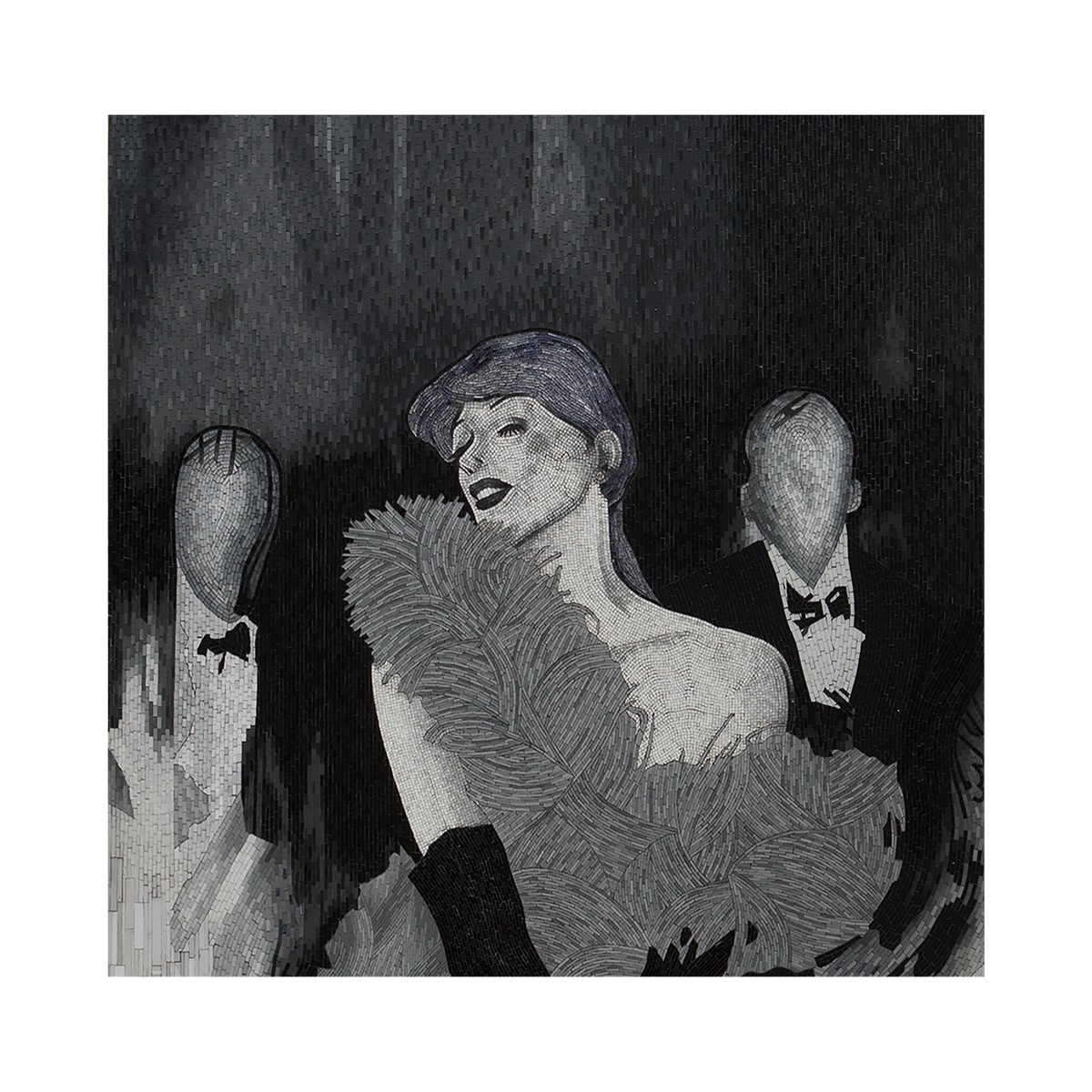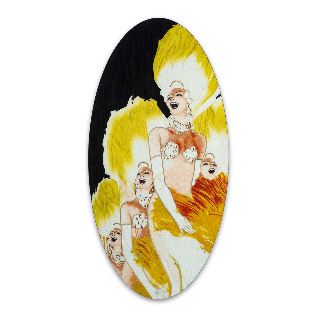 Wall mounted French cleat hanging system. Mosaic inlay of the highest quality, comprising of thousands of hand-cut and individually monochrome glass pieces.