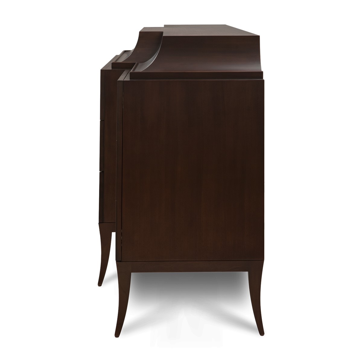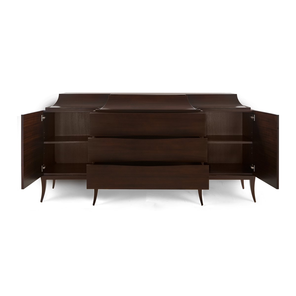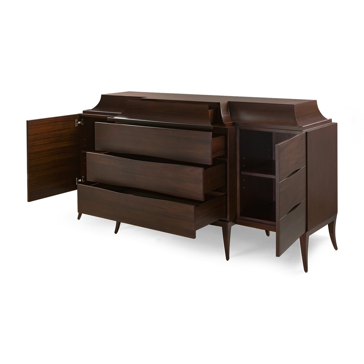 Handsomely hand carved from mahogany, this sleek cabinet is designed with two additional outer side doors with four-drawer chest, including one drawer concealed in the curved top section, also available in a single four-drawer chest version.