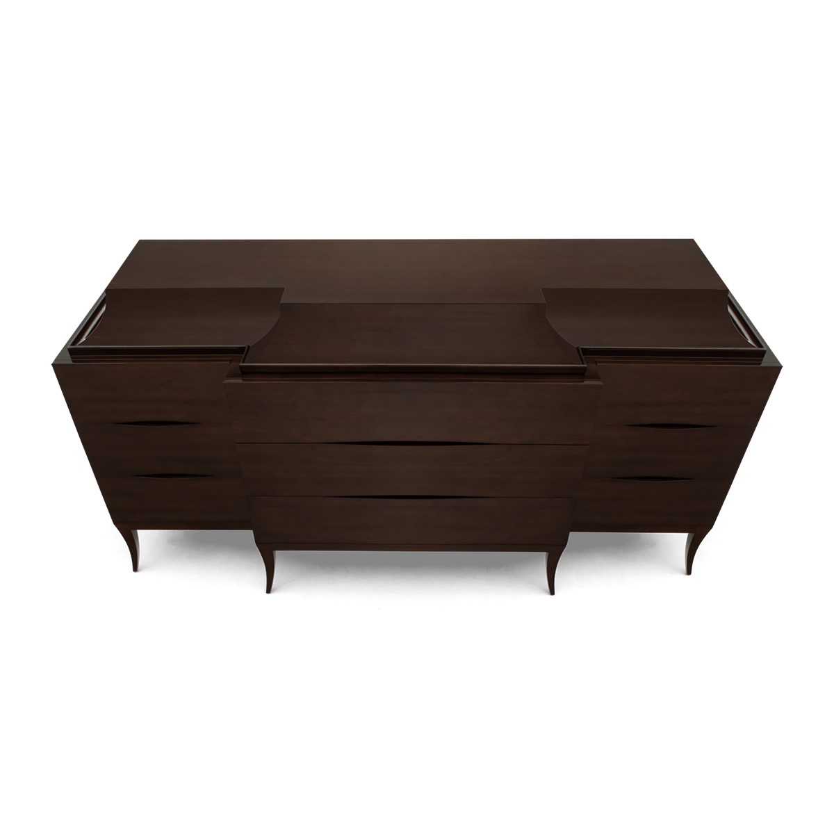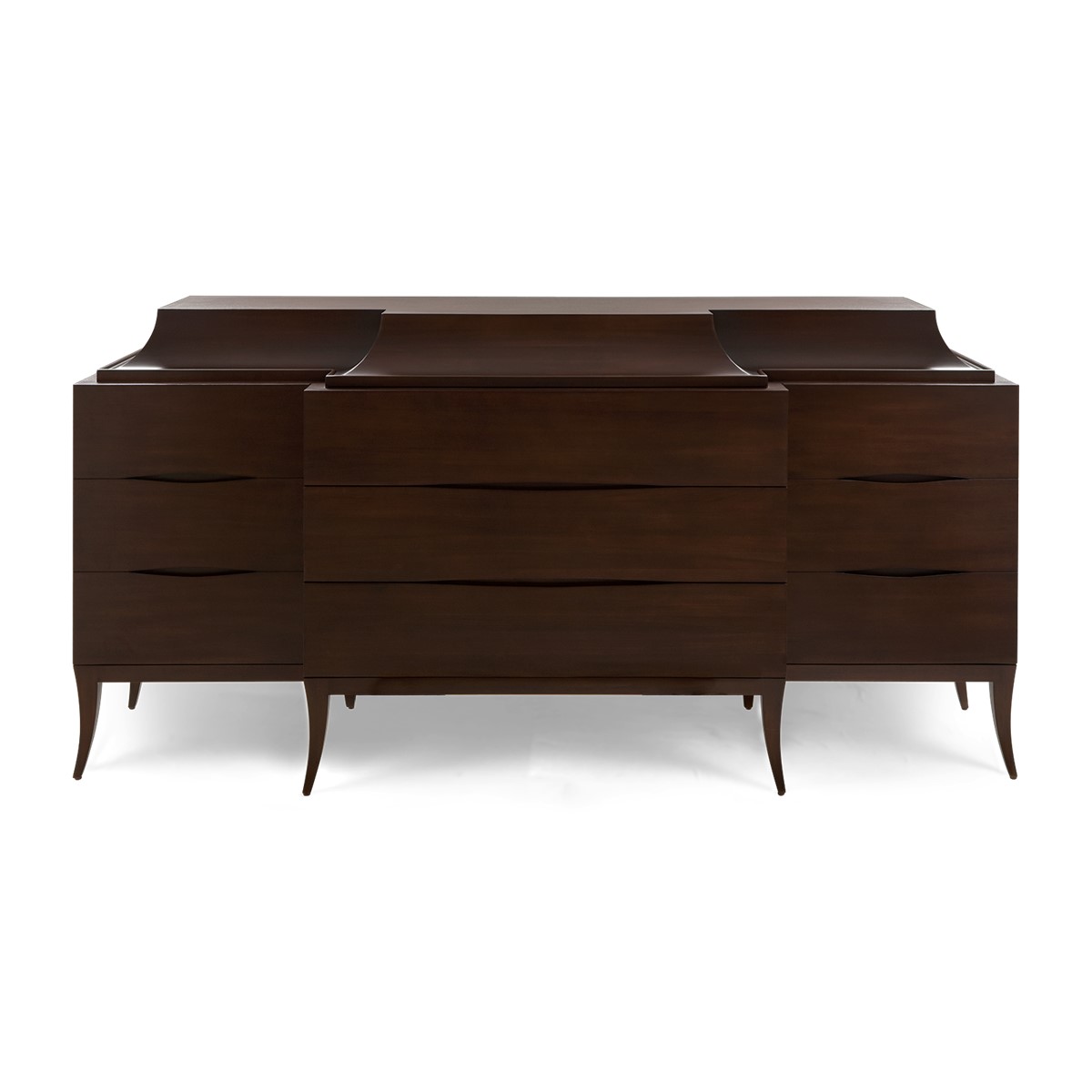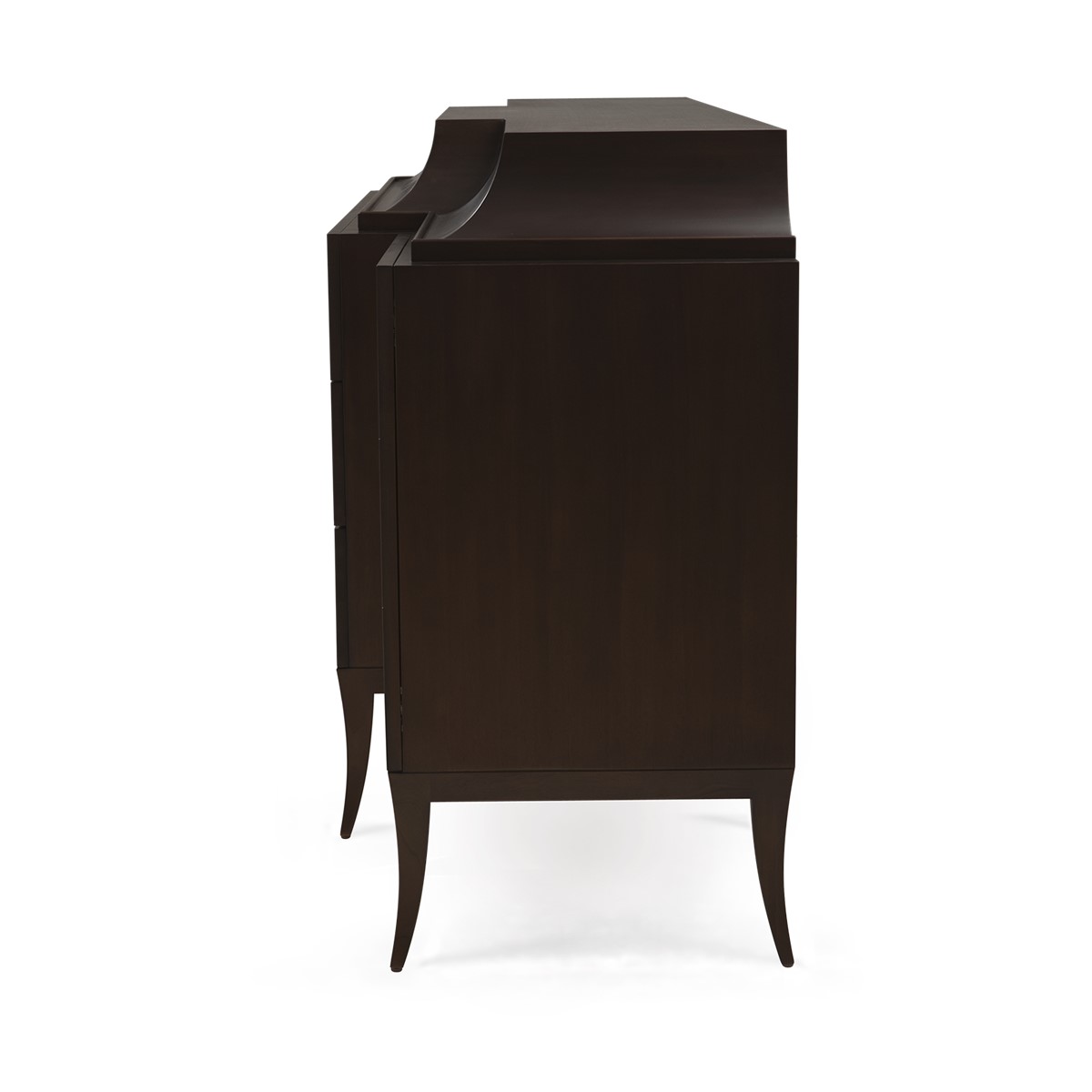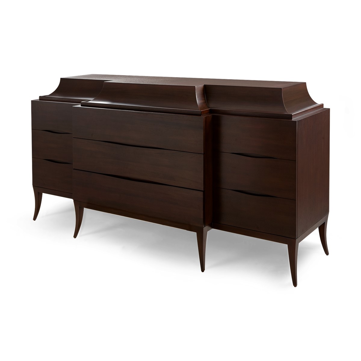 Handsomely hand carved from mahogany, this sleek cabinet is designed with two additional outer side doors with four-drawer chest, including one drawer concealed in the curved top section, also available in a single four-drawer chest version.